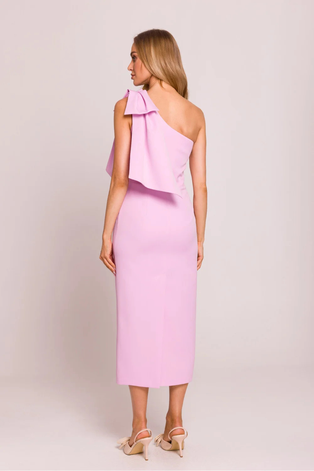 Elegantní midi šaty s olověným střihem, které zdůrazňují ženskou postavu. Model okouzluje asymetrickým střihem s motivem na jedno rameno, ozdobeným efektní mašlí, která dodává eleganci a jedinečný charakter. Vysoké rozeknutí vzadu jemně zdůrazňuje nohu, dodávají kreaci lehkost a smyslnost. Šaty se zapínají po stranách na skrytý zip, co zajišťuje ideální přizpůsobení. Částečná podšívka zaručuje pohodlí při nošení. Navrženo a ušito v Polsku s důrazem na každý detail.