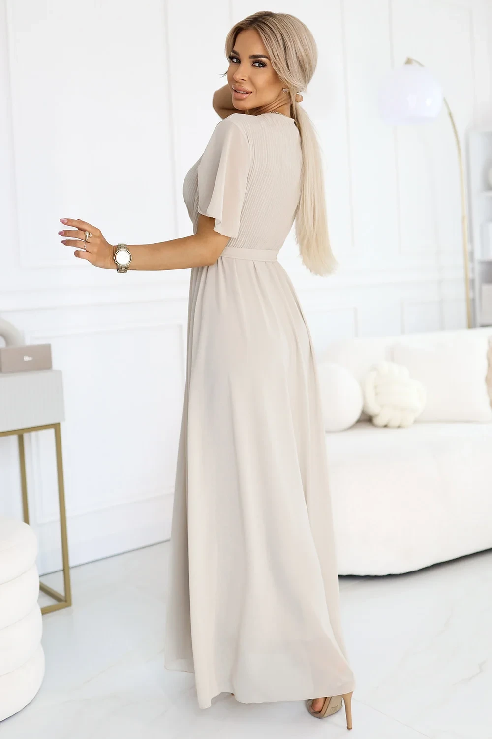 Jemný, ženský a neuvěřitelně elegantní béžový maxi šaty vyrobené z lehkého šifonu jsou skvělou volbou pro mnoho příležitostí. Skvěle se hodí na svatbu, první svatou zpověď, křtiny, rodinné oslavy, romantickou večeři a dokonce i jako šaty pro družičku. Překřížený výstřih krásně zdůrazňuje poprsí, a pásek ve střední části opticky modeluje postavu a zdůrazňuje pas. Vzdušné rukávy a rozkročený spodek dodávají celku lehkosti a elegance. Béžová barva přidává noblesu a hodí se k mnoha typům krásy.