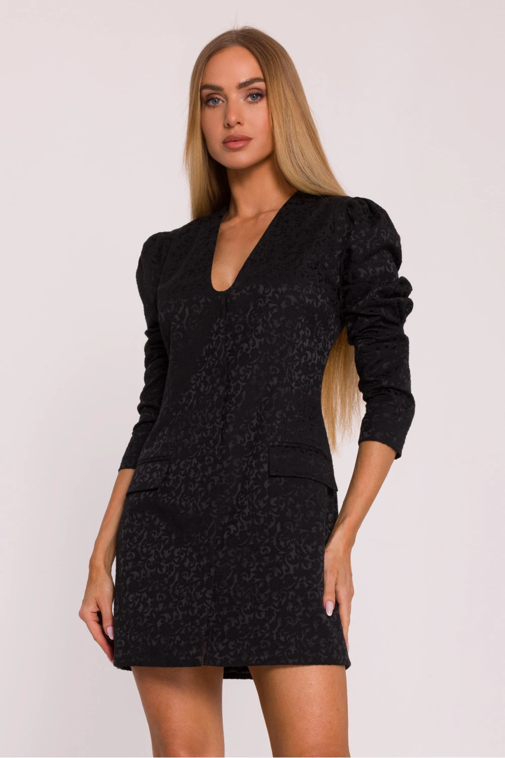 Elegantní šaty z žakárové látky s lehce vyvýšeným rostlinným vzorem jsou návrh, který spojuje klasiku s jemným nádechem modernosti. Pečlivě vybraný materiál dodává celku šlechetný charakter a podšívka po celé délce zajišťuje pohodlí nošení a perfektní uspořádání střihu. Model má hluboký výstřih ve tvaru písmene V, který krásně zúží siluetu a dodá ženskost. Dlouhé rukávy s jemným nafouknutím nahoře dodávají eleganci a lehkost. Zapínání na přední straně, skryté pod plisovaným lemem s knoflíky, zdůrazňuje rafinovaný charakter šatů. Celkový vzhled doplňují napodobeniny kapes s ozdobnými klopy, které celku přidávají elegantní nádech. Střih přiléhavý, lehce talířovaný, jemně zdůrazňuje siluetu, spojuje výrazně zvýrazněný vršek s přímým dnem. Mini délka dodává kreaci moderní výraz, dělající z ní skvělou volbu jak na večerní vycházky, tak na elegantní setkání. Navrženo a ušito v Polsku, vytvořeno pro ženy, které oceňují kvalitu, styl a nadčasovou eleganci.