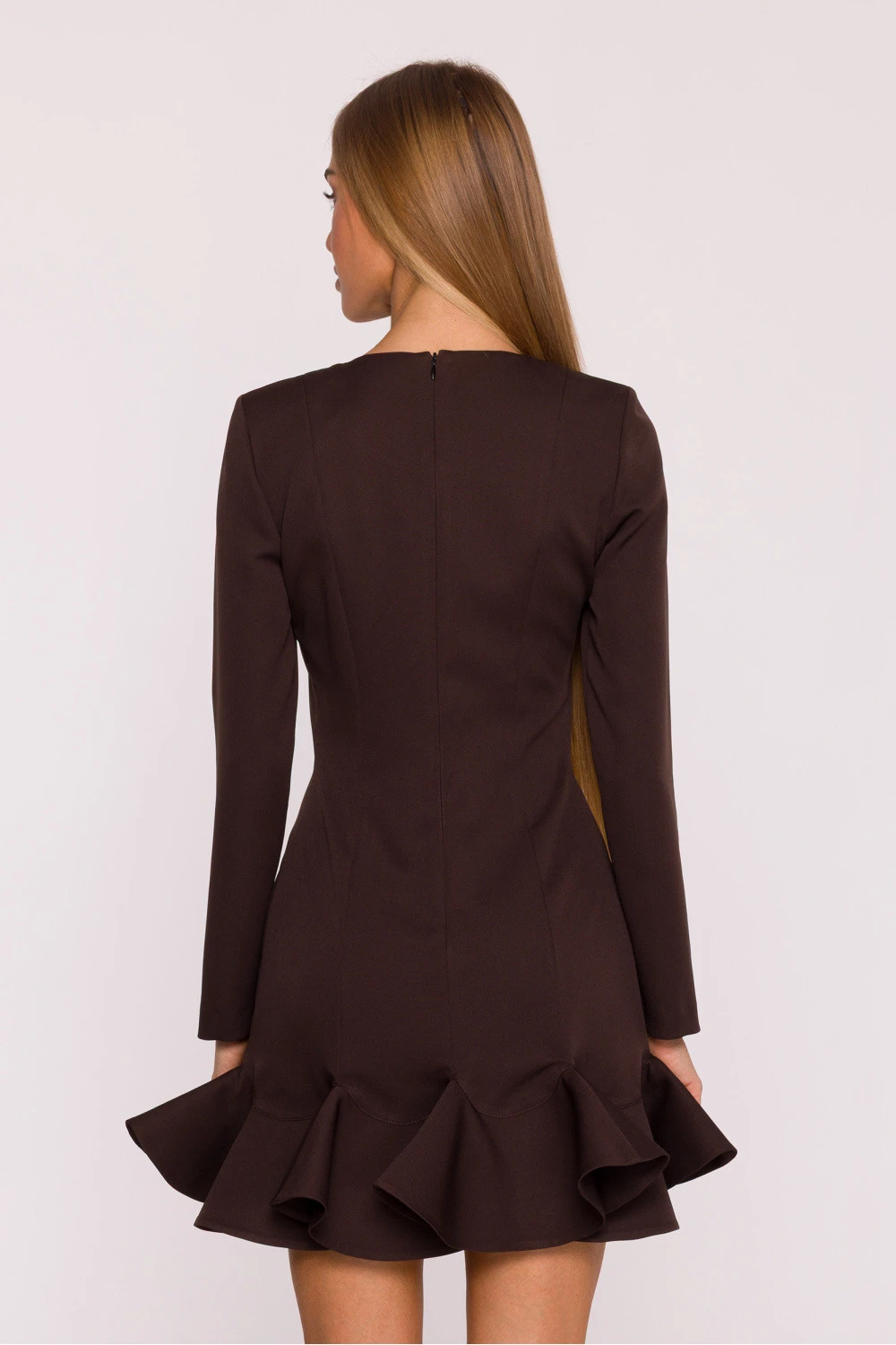 Jemný a ženský šaty šité z hladké látky s matným povrchem jsou skvělým návrhem na mnoho příležitostí. Jednoduchý tvar byl oživen fantazijní volánkem na spodním okraji, který dodává celku lehkost a dívčího půvabu. Model má klasický, polokruhový výstřih a dlouhé rukávy, díky čemuž vypadá elegantně a nadčasově. Skrytý zip na zádech zajistí pohodlné oblékání a estetické provedení. Chybějící kapsy a podšívka dělají z šatů lehký, pohodlný a skvěle se usazují na postavě. Střih byl navržen tak, aby jemně zdůrazňoval postavu - horní část tvoří jednoduchá, lehce talířovaná linie s modelujícími prošitími, zatímco spodní část s rozkročením s volánem krásně pracuje v pohybu. Mini délka dodává kreaci svěžest a moderní charakter. Navrženo a ušito v Polsku pro ženy, které oceňují jednoduchou eleganci s nádechem originality.