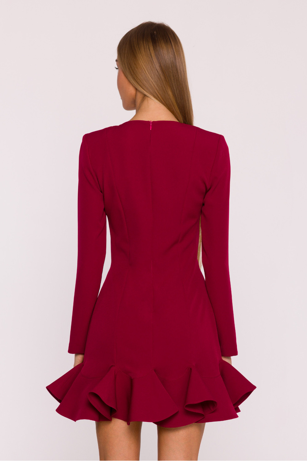 Jemný a ženský šaty ušitý z hladké látky s matným povrchem je skvělým návrhem pro mnoho příležitostí. Jednoduchý tvar byl obohacen fantazií na spodku, co dodává celku lehkost a dívčí kouzlo. Model má klasický, polokruhový výstřih a dlouhé rukávy, díky čemuž vypadá elegantně a nadčasově. Skrytý zip na zádech zajišťuje pohodlné oblékání a estetické provedení. Bez kapes a podšívky jsou šaty lehké, pohodlné a skvěle padnou na postavě. Střih byl navržen tak, aby jemně zdůrazňoval figuru - horní část je jednoduchá, lehce talířovaná s modelujícími švy a spodní část s falbánou krásně pracuje v pohybu. Mini délka přidává kreaci svěžest a moderní charakter. Navrženo a ušito v Polsku pro ženy, které oceňují jednoduchou eleganci s nádechem originality.
