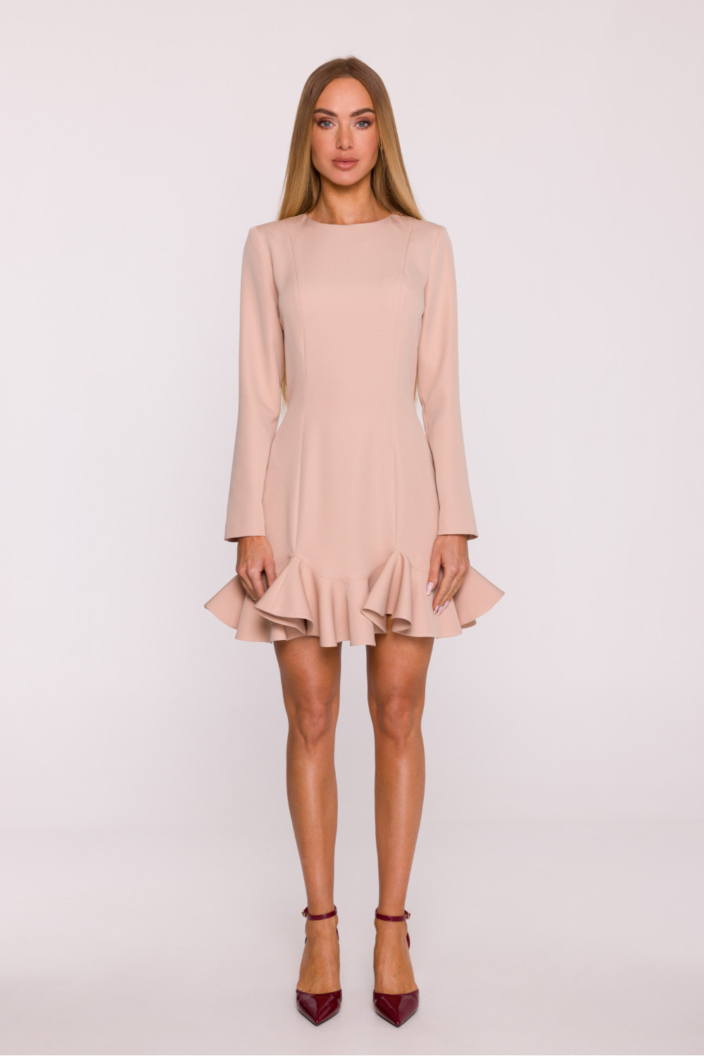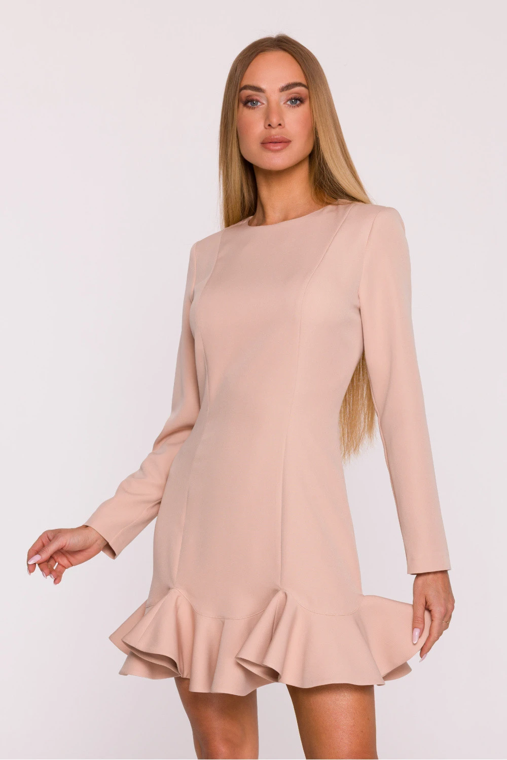 Jemný a ženský šaty ušité z hladké látky s matným povrchem jsou skvělým návrhem pro mnoho příležitostí. Jednoduchý tvar byl obohacen fantazijním volánem dole, který dodává celku lehkost a dívčí kouzlo. Model má klasický, polokruhový výstřih a dlouhé rukávy, díky čemuž vypadá elegantně a nadčasově. Skrytý zip vzadu zajišťuje pohodlné oblékání a estetické dokončení. Chybějící kapsy a podšívka dělají šaty lehkými, pohodlnými a skvěle se tvarujícími na postavě. Střih byl navržen tak, aby jemně zdůrazňoval postavu - horní část má jednoduchou, lehce talírovanou linii s modelujícími prošivy a spodní část rozšířenou s volánem krásně pracuje v pohybu. Mini délka dodává kreaci svěžest a moderní charakter. Navrženo a ušito v Polsku pro ženy, které oceňují jednoduchou eleganci s nádechem originality.
