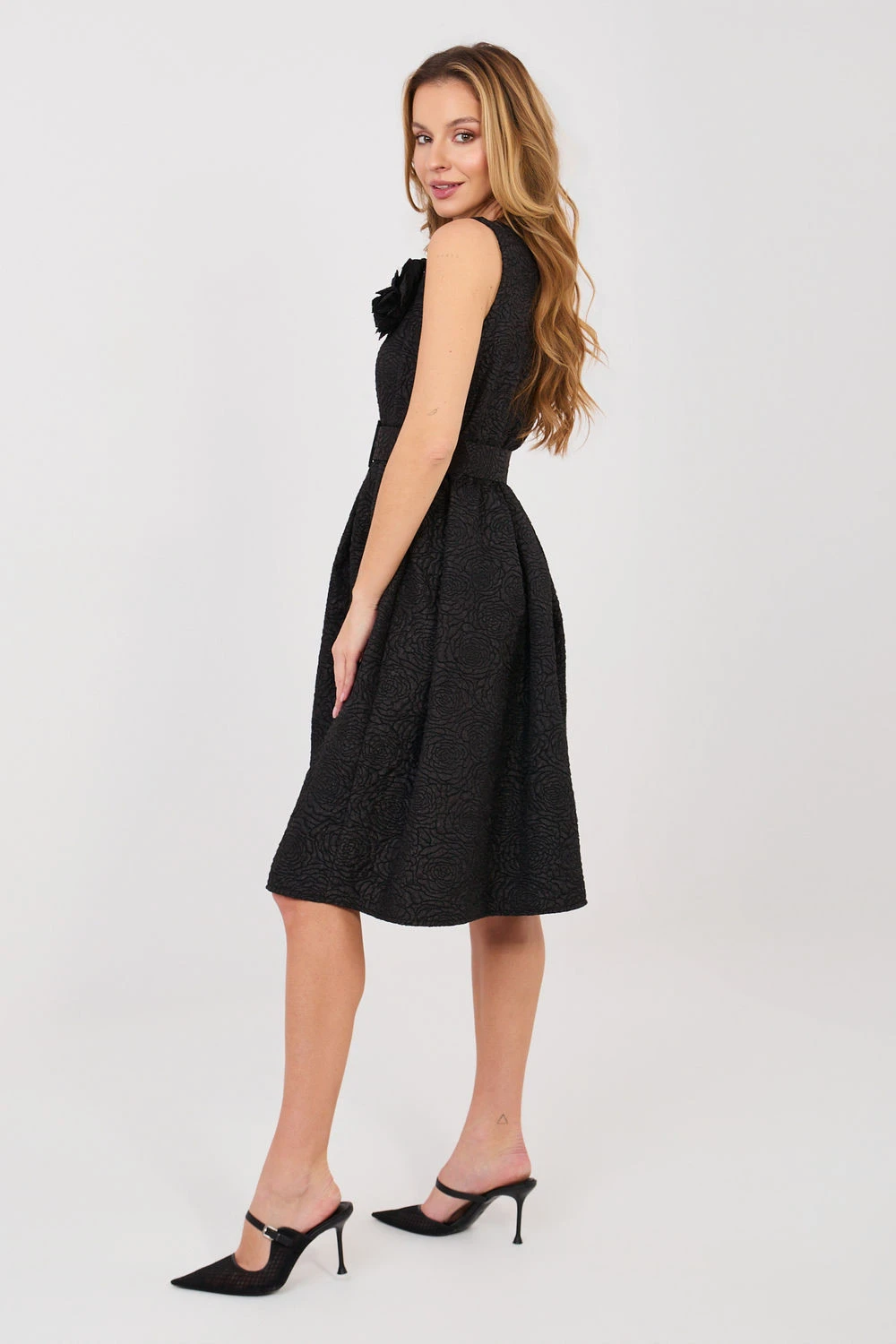 Elegantní návštěvní šaty navržené s ohledem na výjimečné příležitosti a stylové večírky. Rozkročený střih krásně zdůrazňuje pas a dodává postavě lehkost, zatímco délka nad kolena přidává třídu a nadčasovou eleganci. Model vyrobený z vysoce kvalitní směsi polyesteru a viskózy, která zajišťuje pohodlí nošení a skvělé uspořádání látky. Různorodá struktura látky dodává celku originální charakter a jemnou hloubku. Šaty bez rukávů s klasickým kulatým výstřihem vypadají mimořádně elegantně. Pasové střižení s ozdobnými záhyby krásně modeluje postavu a zdůrazňuje ženské tvary. Součástí je zapínací opasek, který dále zdůrazňuje pas, a odpínatelná brož ve tvaru květu, umožňující přizpůsobit stylizaci události. Jedná se o skvělou volbu pro oslavy, rodinné slavnosti a elegantní setkání, kdy chcete vypadat výjimečně a elegantně.