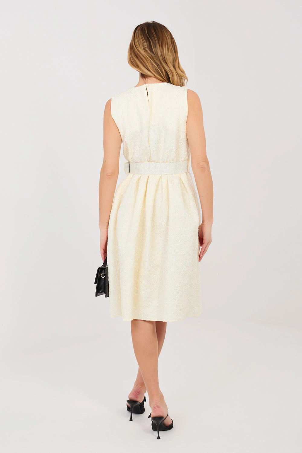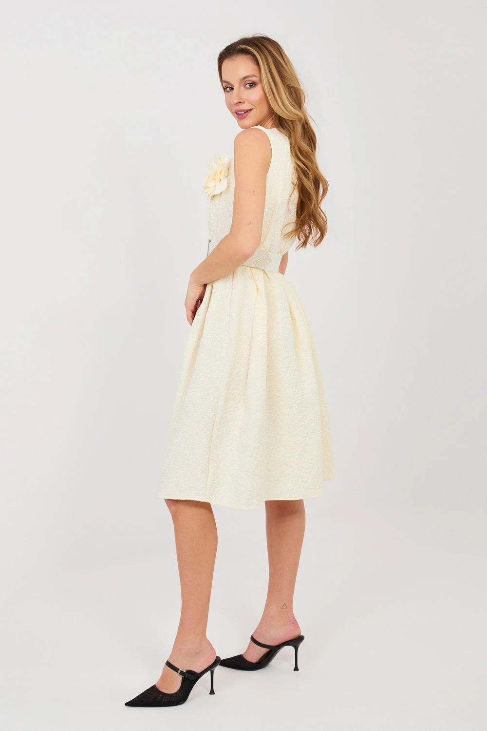 Elegantní návštěvní šaty vytvořené s ohledem na výjimečné příležitosti a stylové večírky. Rozkročený střih krásně zdůrazňuje pas a dodává siluetě lehkost, zatímco délka za koleno přidává třídu a nadčasovou eleganci. Model vyrobený z vysoce kvalitní směsi polyesteru a viskózy, která zajistí pohodlí nošení a dokonalé uspořádání materiálu. Různorodá struktura látky dodává celku originální charakter a jemnou hloubku. Šaty bez rukávů s klasickým kulatým výstřihem vypadají mimořádně elegantně. Zapínání v pasu s ozdobnými záhyby krásně modeluje siluetu a zdůrazňuje ženské tvary. Součástí je zapínací opasek, který navíc zdůrazňuje pas, a odnímatelná brož ve tvaru květu, umožňující sladit outfit s příležitostí. To je skvělá volba na večírky, rodinné oslavy a elegantní setkání, kdy chcete vypadat výjimečně a s elegancí.