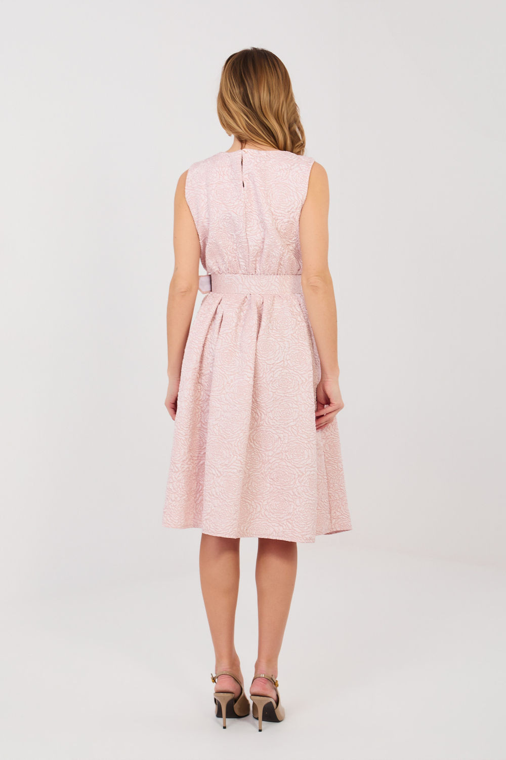 Elegantní návštěvní šaty vytvořené s ohledem na výjimečné události a stylové večírky. Rozkročený střih krásně zdůrazňuje pas a dodává postavě lehkost, zatímco délka pod koleno dodává třídu a nadčasovou eleganci. Model vyrobený z vysoce kvalitní směsi polyesteru a viskózy, která zajišťuje pohodlí nošení a skvělé padnutí materiálu. Obohacená struktura tkaniny dodává celku originální charakter a jemnou hloubku. Šaty bez rukávů s klasickým kulatým výstřihem vypadají mimořádně elegantně. V pasu se ořezávají s ozdobnými záhyby, krásně modelují postavu a zdůrazňují ženské tvary. Součástí je zapínací opasek, který dále zdůrazňuje pas, a odnímatelná brož ve tvaru květu, která umožňuje přizpůsobit stylizaci události. Jedná se o skvělou volbu na oslavy, rodinné události a elegantní setkání, kdy chcete vypadat výjimečně a elegantně.