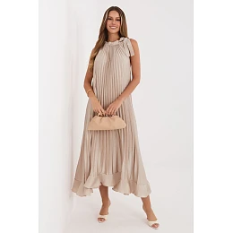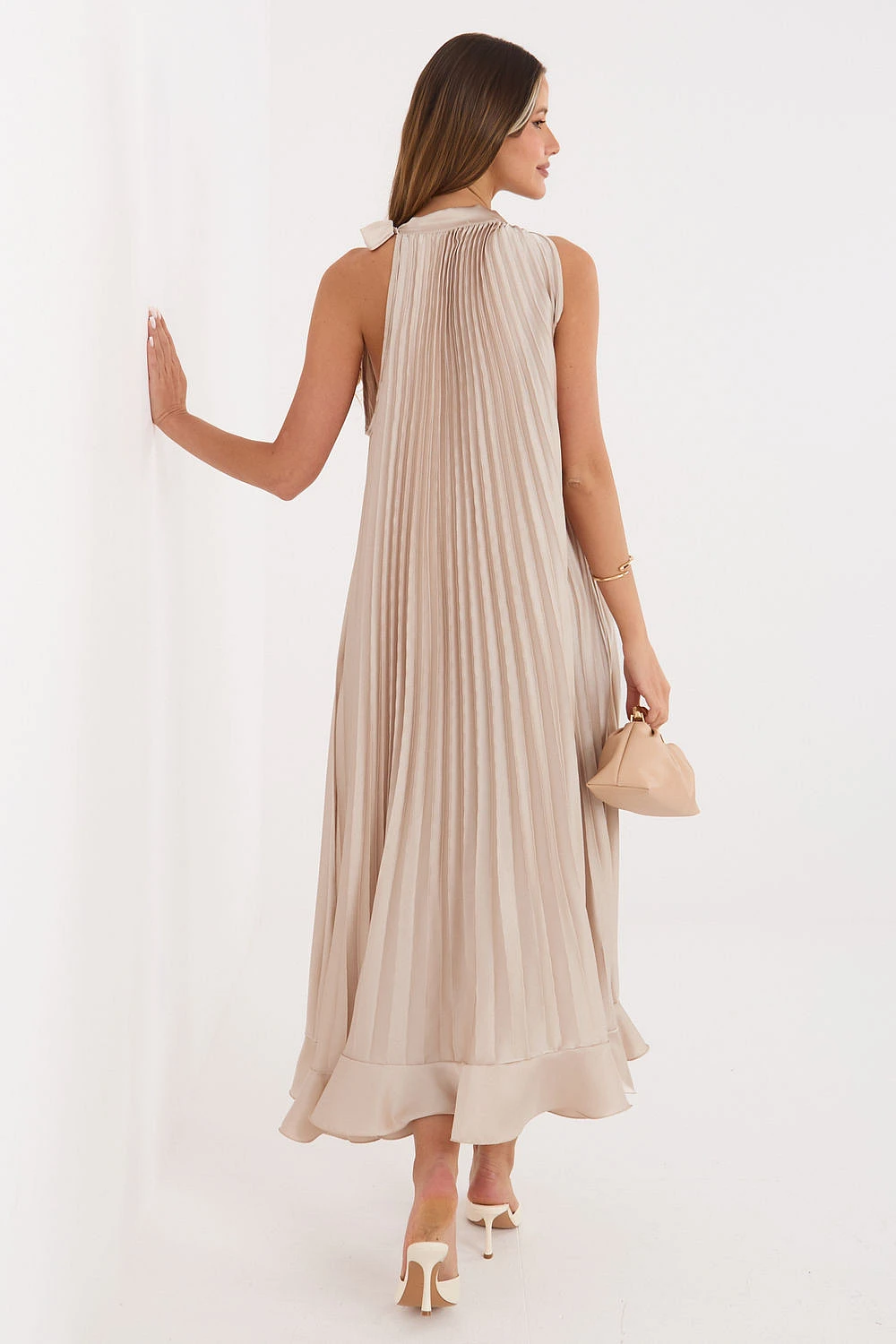 Pleťové koktejlové šaty jsou elegantní nabídkou, která se skvěle hodí na speciální příležitosti a večírky. Jejich lehký, vzdušný střih midi délky se krásně otevírá při pohybu, zdůrazňuje ženskou siluetu a dodává stylizaci jemnou lehkost. Model bez rukávů s klasickým, kulatým výstřihem vypadá nadčasově a elegantně. Originálním prvkem je uvázání na levém rameni, které šatě dodává jedinečný charakter a přitahuje pozornost. Spodní část zdobená jemným volánem dodává celku romantického šarmu a lehkosti. Hladký materiál z polyesteru, viskózy a elastanu zaručuje pohodlí nošení, správné přizpůsobení a volnost pohybu. Jedná se o ideální společenské šaty pro ženy, které ocení eleganci v moderním podání.
