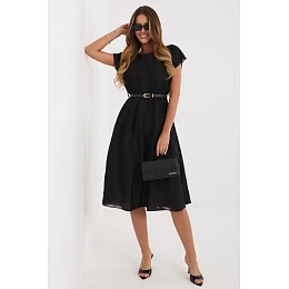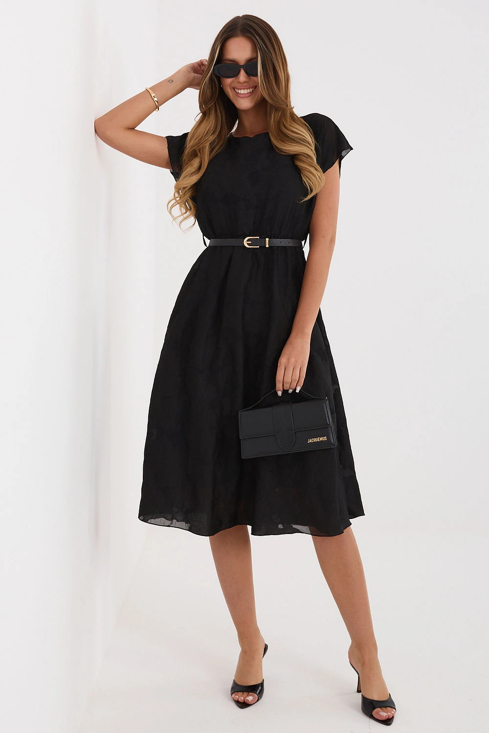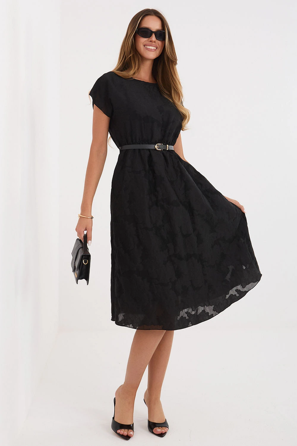 Elegantní šaty s rozkročeným střihem, ideální na speciální příležitosti a večírky. Model midi délky krásně zdůrazňuje postavu, zároveň poskytuje pohodlí a volnost pohybu. Krátký rukáv a klasický kulatý výstřih dodávají celku nadčasový charakter. Šaty jsou vyrobeny z vysoce kvalitní směsi lyocellu a polyesteru, díky čemuž je materiál příjemný na dotek, lehký a dobře padne na tělo. Různorodá struktura látky dodává šatům originalitu a jemnou eleganci. Model nemá zapínání, což zvyšuje pohodlí nošení. Vnitřek je vybaven podšívkou, která zajišťuje lepší přizpůsobení a pohodlí. Další výhodou je zapínací opasek, který zdůrazňuje pas a umožňuje přizpůsobit šaty postavě. Je to skvělá volba pro ženy, které si cení styl, pohodlí a eleganci v moderním provedení.