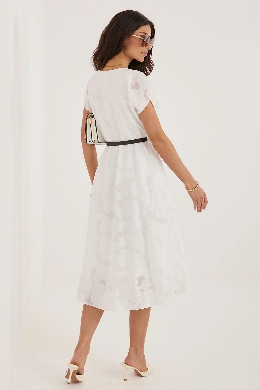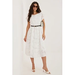 Elegantní šaty s rozkročeným střihem, ideální na speciální příležitosti a večírky. Model midi délky krásně zdůrazňuje postavu, zároveň poskytuje pohodlí a volnost pohybu. Krátký rukáv a klasický, kulatý výstřih dodávají celku nadčasový charakter. Šaty jsou vyrobeny z vysoce kvalitní směsi lyocellu a polyesteru, díky čemuž je materiál příjemný na dotek, lehký a dobře padne na tělo. Pestrá struktura látky dodává originalitu a jemnou eleganci. Model nemá zapínání, co zvyšuje pohodlí nošení. Vnitřek je vybaven podšívkou, která zajišťuje lepší přizpůsobení a pohodlí. Další výhodou je zapínací pásek, který zdůrazňuje pas a umožňuje přizpůsobit šaty postavě. Je to skvělá volba pro ženy, které si cení stylu, pohodlí a elegance v moderním provedení.