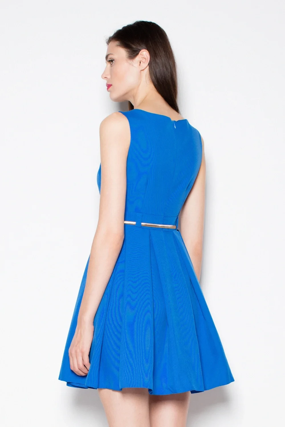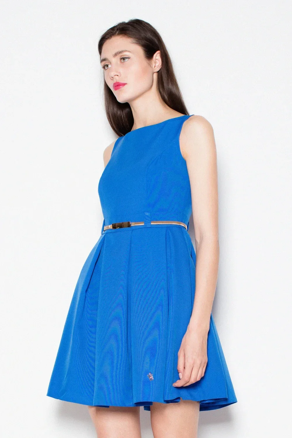 Jednoduché šaty se záhyby, bez rukávů, v pase přestřižené. Navíc pásek. Ideální pro každou příležitost.
