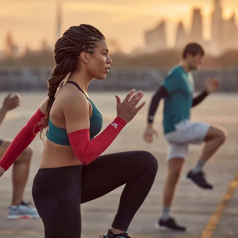 Rukávy jsou vyrobeny z prodyšného, lehkého materiálu (kombinace nylonu a elastanu), takže jsou ideální pro běh, posilování a mnoho dalších sportů. Vlhkost je rychle odváděna pryč, takže pot při běhu nezpůsobuje nepříjemné pocení.