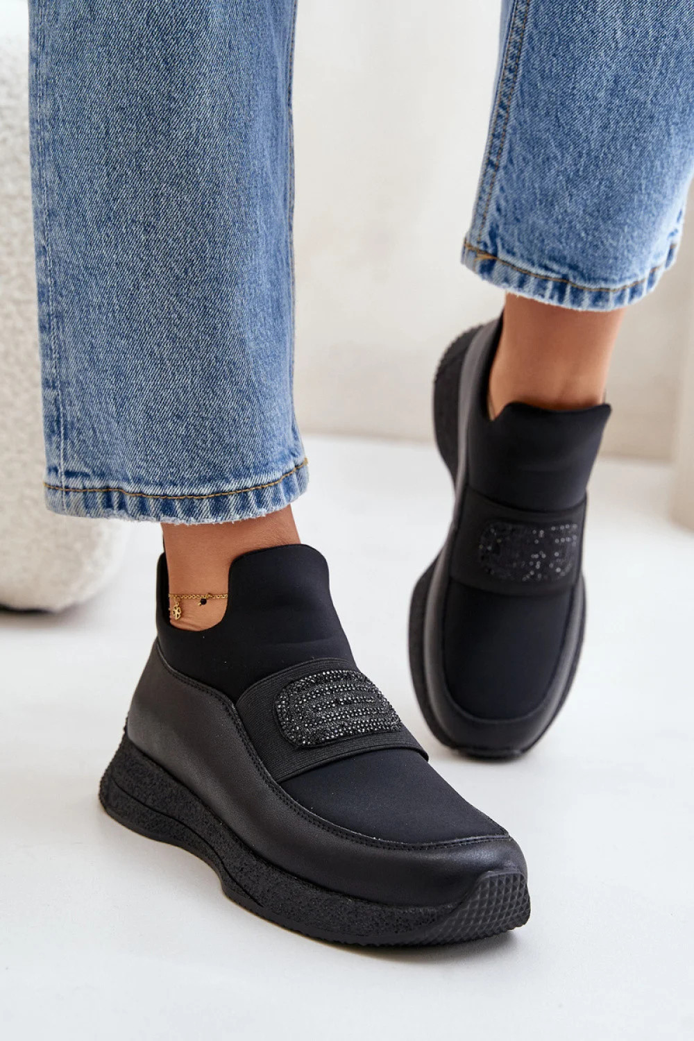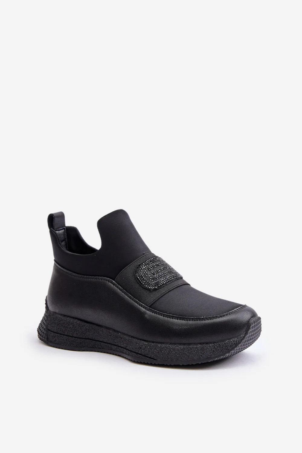 Sportovní obuv vyrobená z kombinace přírodní kůže a tkaniny. Stojí na platformě. Uvnitř jsou zateplené přikrývkou na boty, což z nich činí ideální volbu pro chladnější dny. Na přední straně je na pásku lesklý prvek, který dodává elegantní nádech.