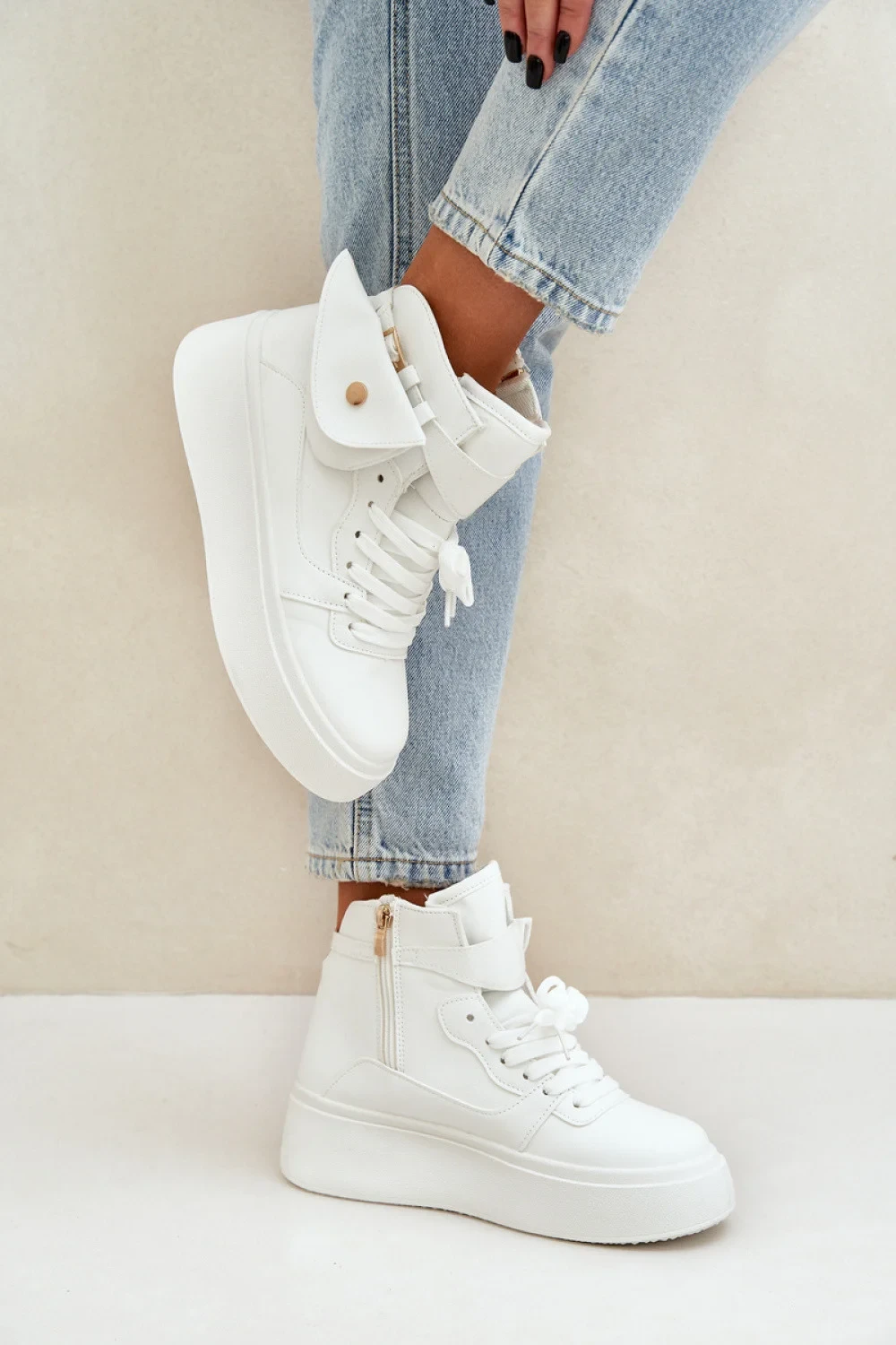 Vysoké tenisky pro ženy vyrobené z vysoce kvalitní ekokože jsou spojením moderního stylu a pohodlí. Umístěné na masivní platformě poskytují pohodlí nošení a dodatečnou tlumení nárazů. Svršek byl obohacen o malou, odnímatelnou taštičku, která dodává originální charakter. Model se vyznačuje zaoblenými špičkami a klasickým šněrováním, které umožňuje ideální přizpůsobení k noze. Tenisky se skvěle hodí jako součást městských stylizací, dodávají jim módní a streetwearový výraz. Ideální volba pro ženy, které ocení funkčnost a originální design!