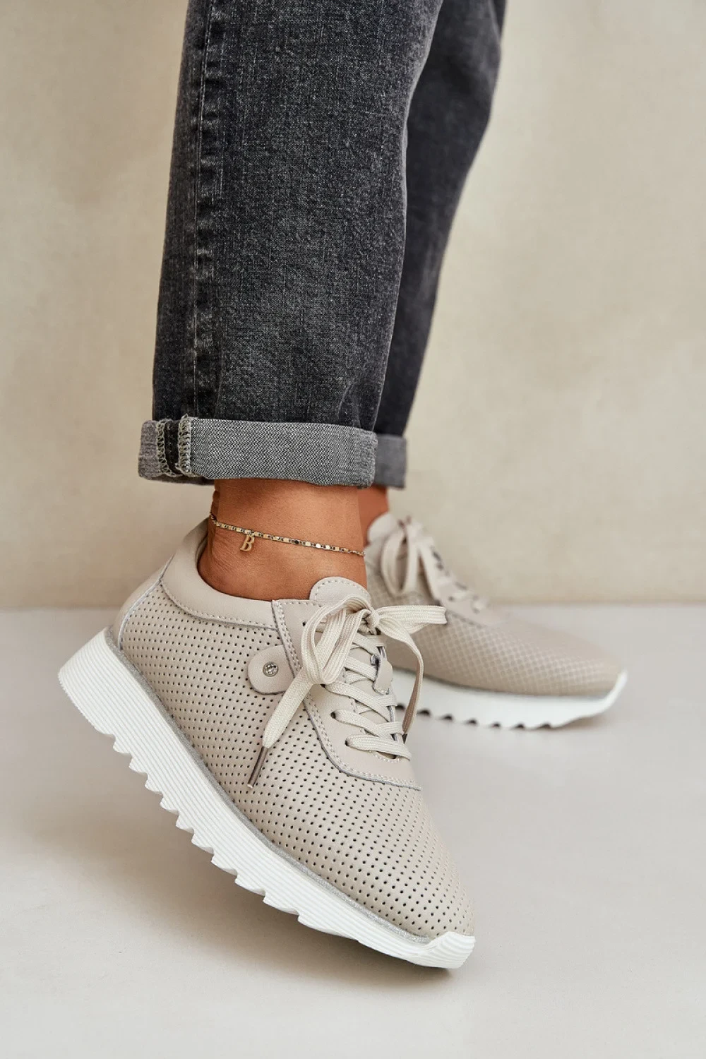 Dámská sportovní obuv z přírodní kůže je kombinací elegance a pohodlí. Umístěné na platformě s jemným flitrem dodávají lesk každému outfitu. Lehké a pohodlné, poskytují pohodlí po celý den. Kůží vložka zaručuje správnou absorpci nárazů a pohodlí při nošení. Tyto boty budou skvělou volbou na každý den, kombinující trendy vzhled s funkcionalitou.