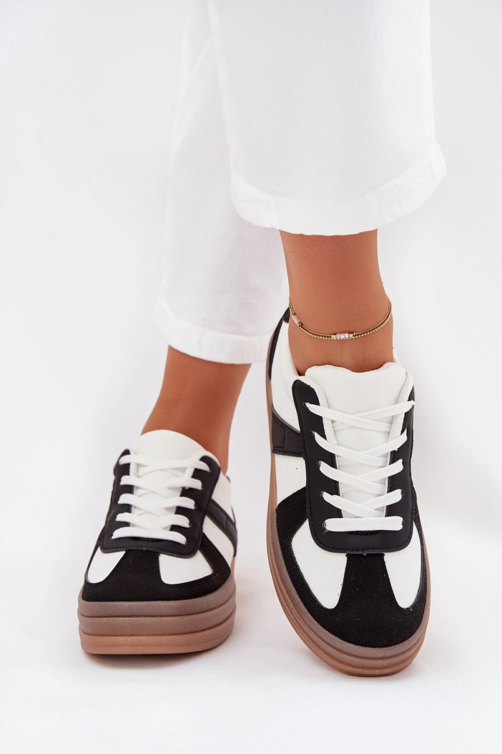 Moderní tenisky z ekokože jsou kombinací stylu a pohodlí. Umístěné na platformě přidávají lehkosti a výšky, poskytují pohodlí během každodenních aktivit. Vyjímatelná pěnová vložka, potažená dalším materiálem, zaručuje měkkost a správnou podporu pro nohu po celý den. Ideální pro každodenní stylizace.