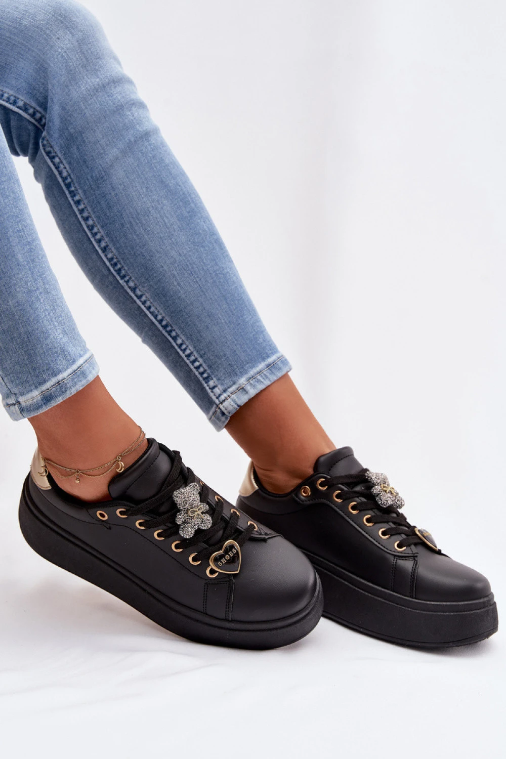 Stylové dámské tenisky z ekokože jsou původní nabídkou pro milovnice módních detailů. Model umístěný na platformě decentně zdůrazňuje postavu a zajišťuje pohodlí při nošení. Šněrování zdobené ozdobami ve tvaru medvídka a srdce dodává výjimečný dívčí charakter. Měkká pěnová vložka, navíc potažená materiálem, zaručuje pohodlí po celý den. Tyto tenisky se skvěle hodí do každodenních městských stylizací.