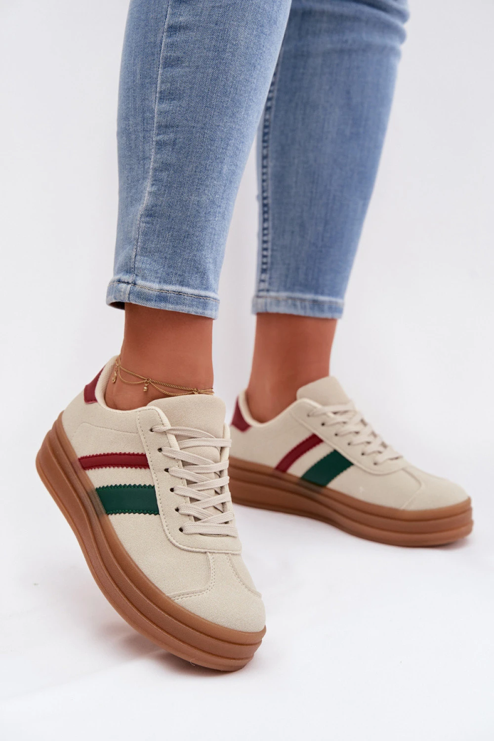 Moderní dámské tenisky umístěné na platformě jsou kombinací pohodlí a stylového vzhledu. Platforma jemně zvyšuje postavu a dodává celému outfitu moderní charakter, zatímco měkká stélka zajišťuje pohodlí po celý den. Tento model se skvěle hodí do každodenních stylizací, skvěle ladí jak s džínami, tak s látkovými kalhotami.