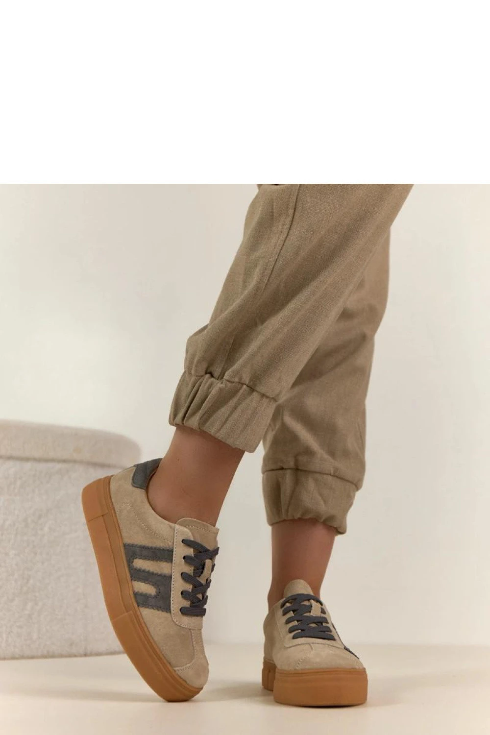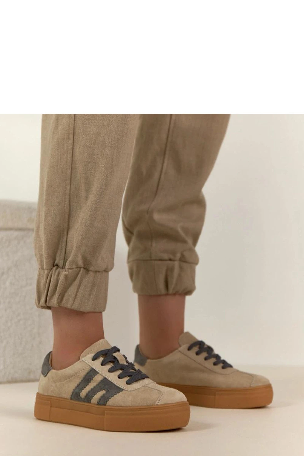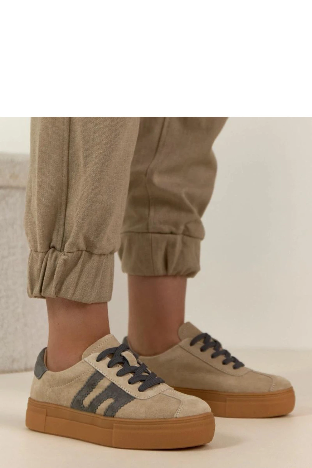 Elegantní sportovní boty vyrobené z vysoce kvalitní přírodní semišové kůže, které skvěle kombinují pohodlí s moderním, městským charakterem. Měkký svršek vypadá elegantně a zaručuje trvanlivost, díky čemuž se model skvěle hodí pro každodenní nošení. Boty mají kulatou špičku, která zaručuje pohodlí a volnost pro prsty. Nízká konstrukce jim dodává lehkost a univerzálnost, snadno je sladíte s džíny, tepláky nebo volnými šaty. Vnitřek je vybaven vložkou z přírodní kůže, která zvyšuje pohodlí nošení a podporuje správnou ventilaci chodidla. Klasické šněrování umožňuje ideální přizpůsobení obuvi. Celý model je umístěn na stabilní platformě o výšce 3,5 cm, která jemně zdvihne postavu, zajišťuje přitom pohodlí a dobrou tlumení. To je skvělá volba pro ty, kteří oceňují kombinaci stylu, kvality a funkčnosti.