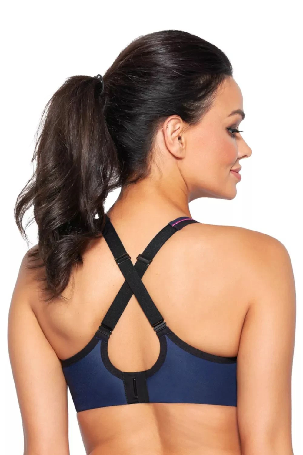 Sportovní podprsenka Dina AVA - tmavě modrá barva - zesílená struktura na podpůrných kosticích - košíčky vyplněné tenkou jemnou pěnou - podšité síťovinou absorbující vlhkost - veškeré vyztužené pásky jsou skryté uvnitř - široká ramínka se zapínáním vzadu podšitá měkkou pěnou