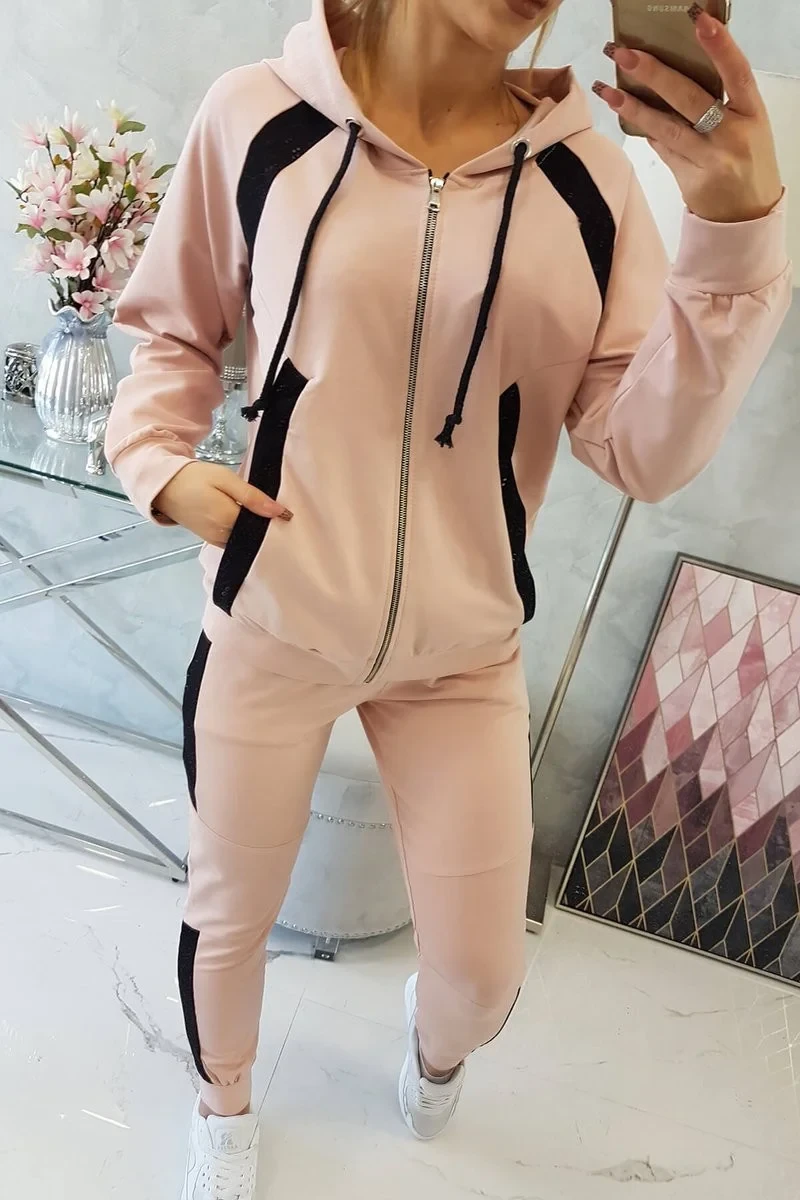 Představujeme vám sadu mikiny a kalhot. Sada je opatřena potrubím. Mikina s kapsami a kapucí. Kalhoty mají kapsy. Sada je vyrobena z vysoce kvalitního materiálu. Velikost je univerzální a vyhovuje dámám, které nosí velikost S, M nebo L.