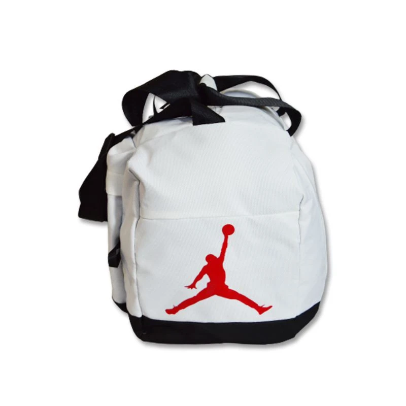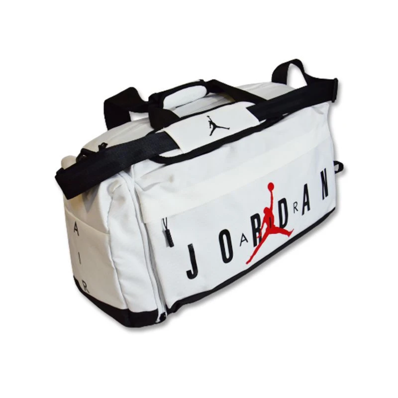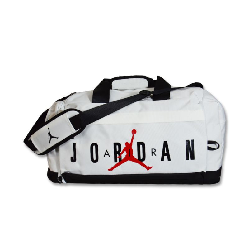 Torba w uniwersalnej, białej kolorystyce z czerwonym logo Jumpmana oraz dużym, czarnym napisem Air Jordanna froncie.