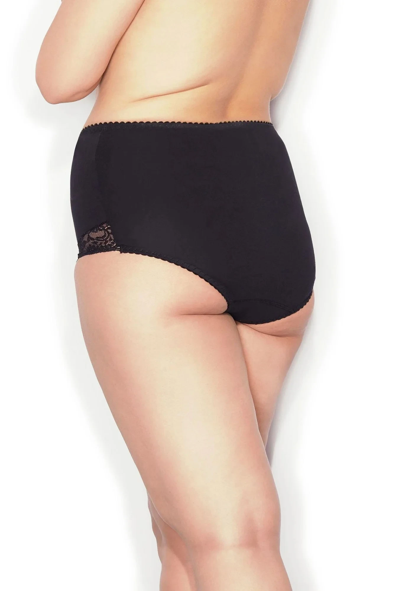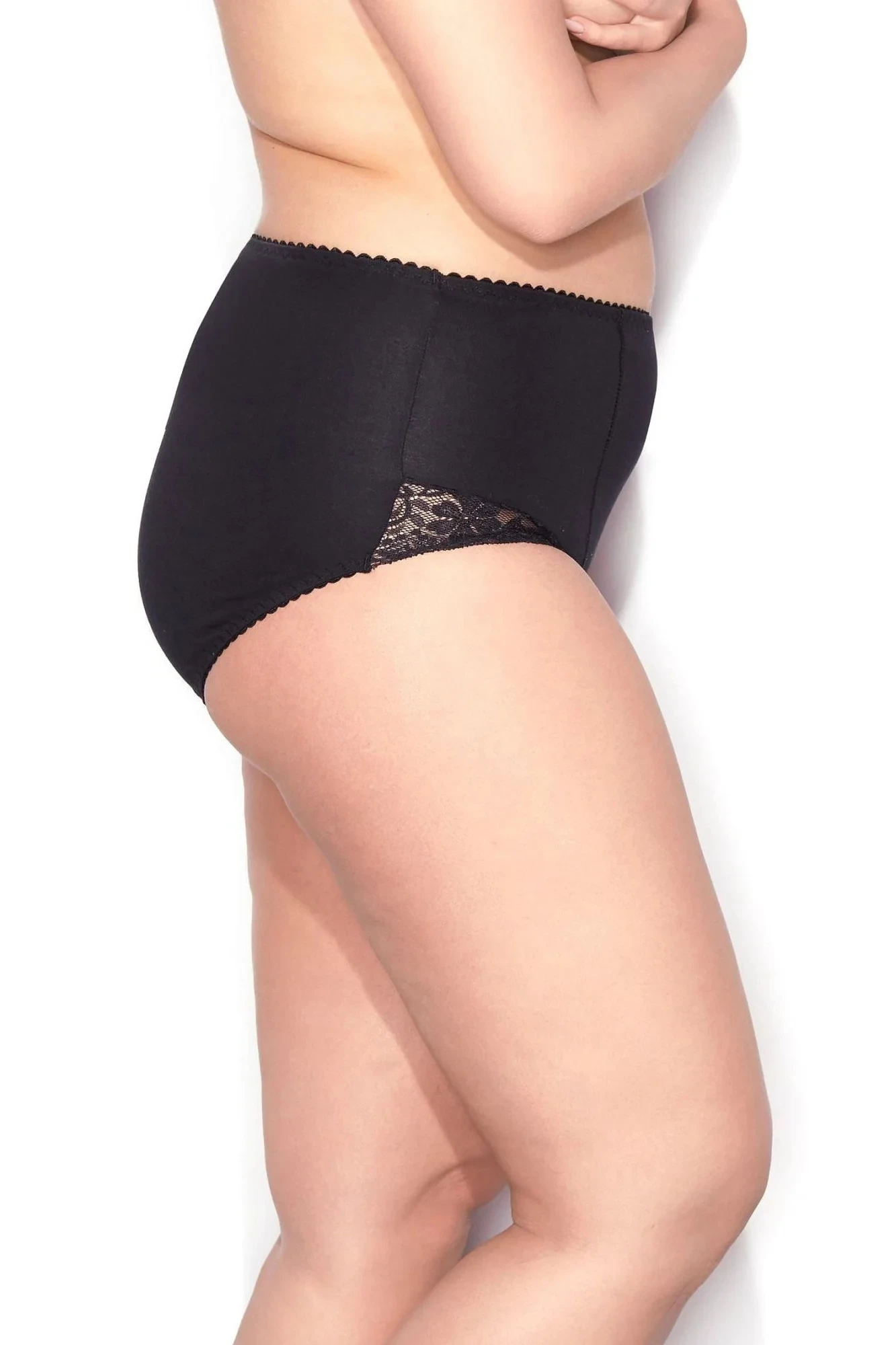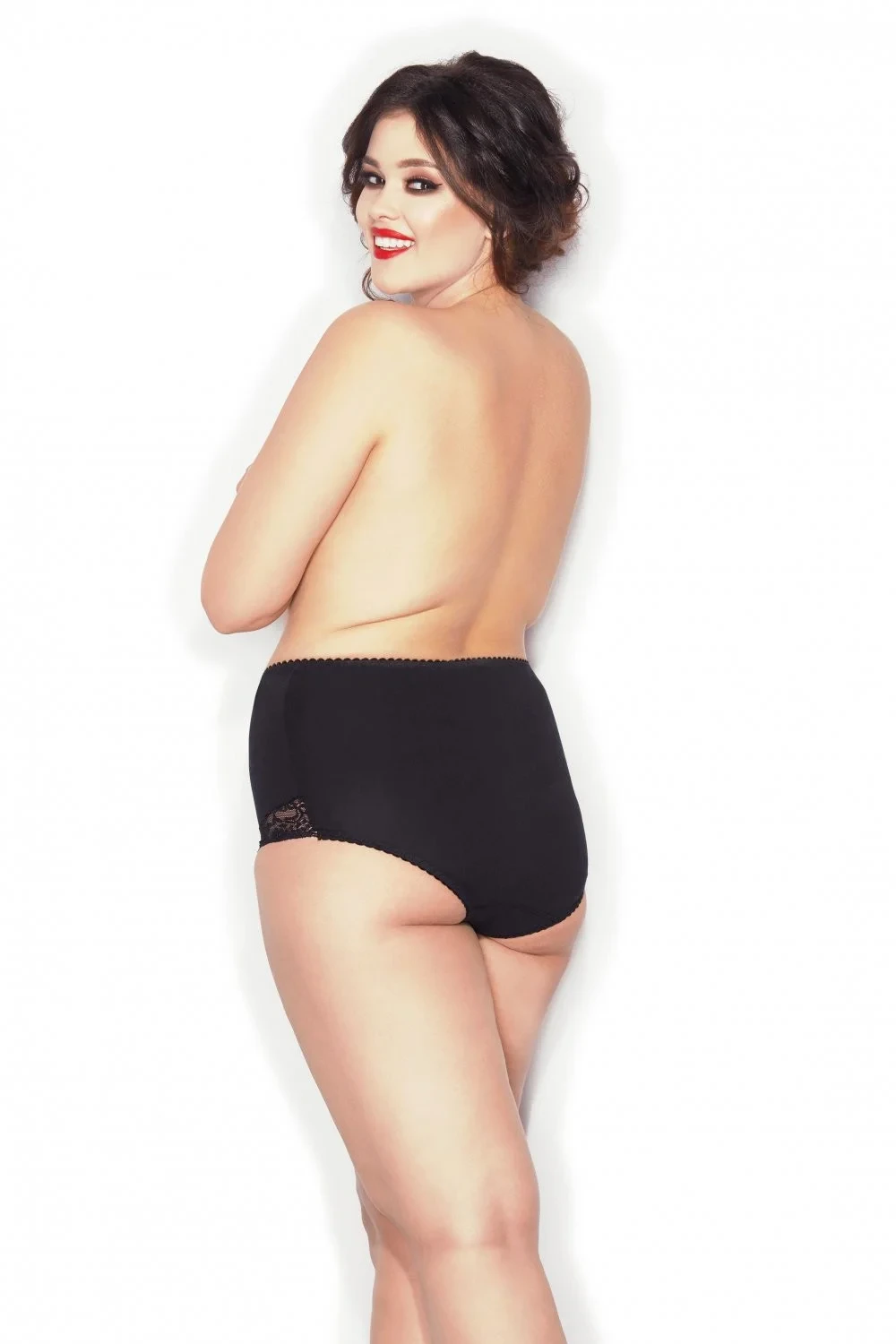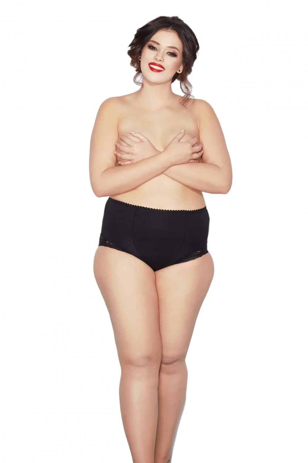 Dámské stahovací kalhotky Ela plus Mitex - černá barva - kalhotky mají lehce zvýšený pas - příjemný, pevný materiál - obepnou oblast boků a část bříška - elegantní design - nohavičky jsou lemované krajkou ve stejné barvě - pod oblečením nejdou vidět