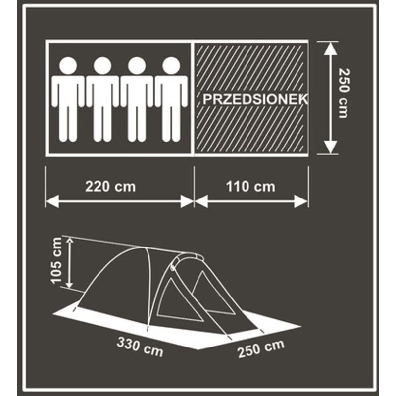 - Wymiary zew. ok.: 250 x 330 x 105 cm (szer. x dł. namiotu + przedsionek x wys.)