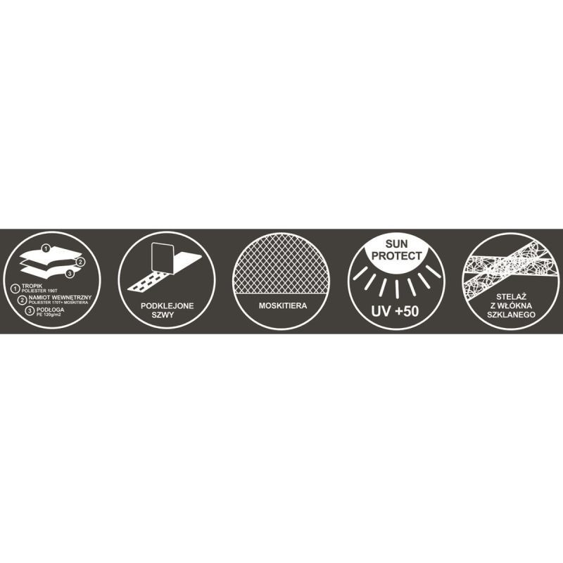 - Materiał: materiał wewnętrzny (sypialnia) poliester 170 T z siatką i moskitierą, stelaż włókno szklane 2X8.5mm /1x7.9mm, podłoga PE 120 g/m2, tropik 190T poliester wzmocniony PU