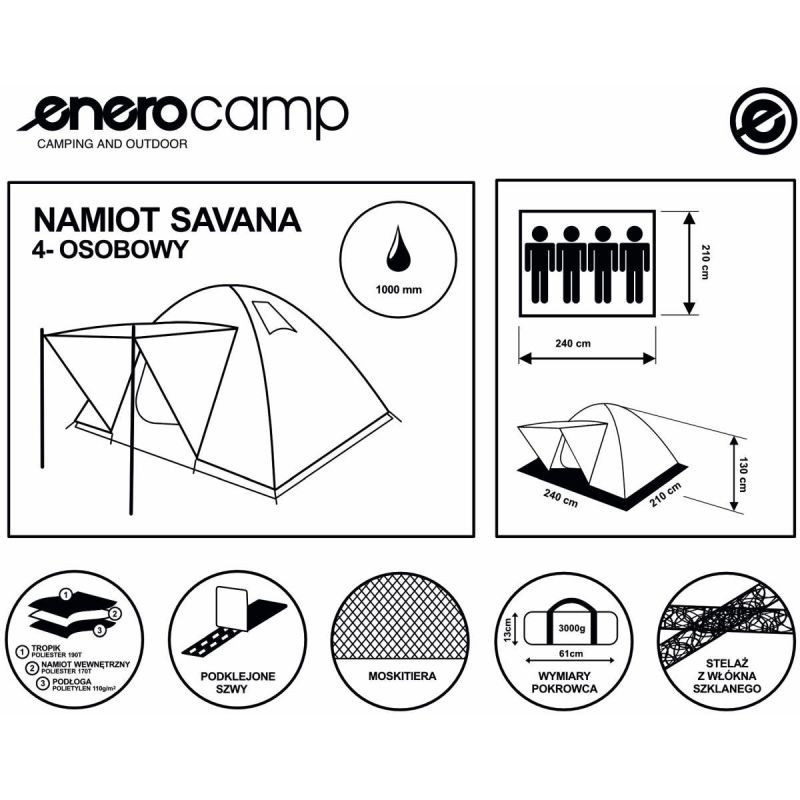 Relaksuj się, odpoczywaj i śpij w wygodnym namiocie Savana. Namiot dla 4 osób, polecany na biwaki i wakacje. Produkt jest łatwy w montażu, doskonale sprawdzi się podczas nadchodzącego sezonu letniego.