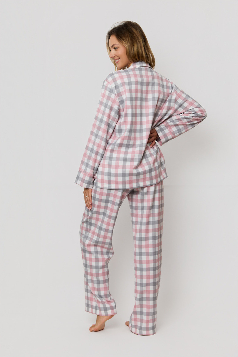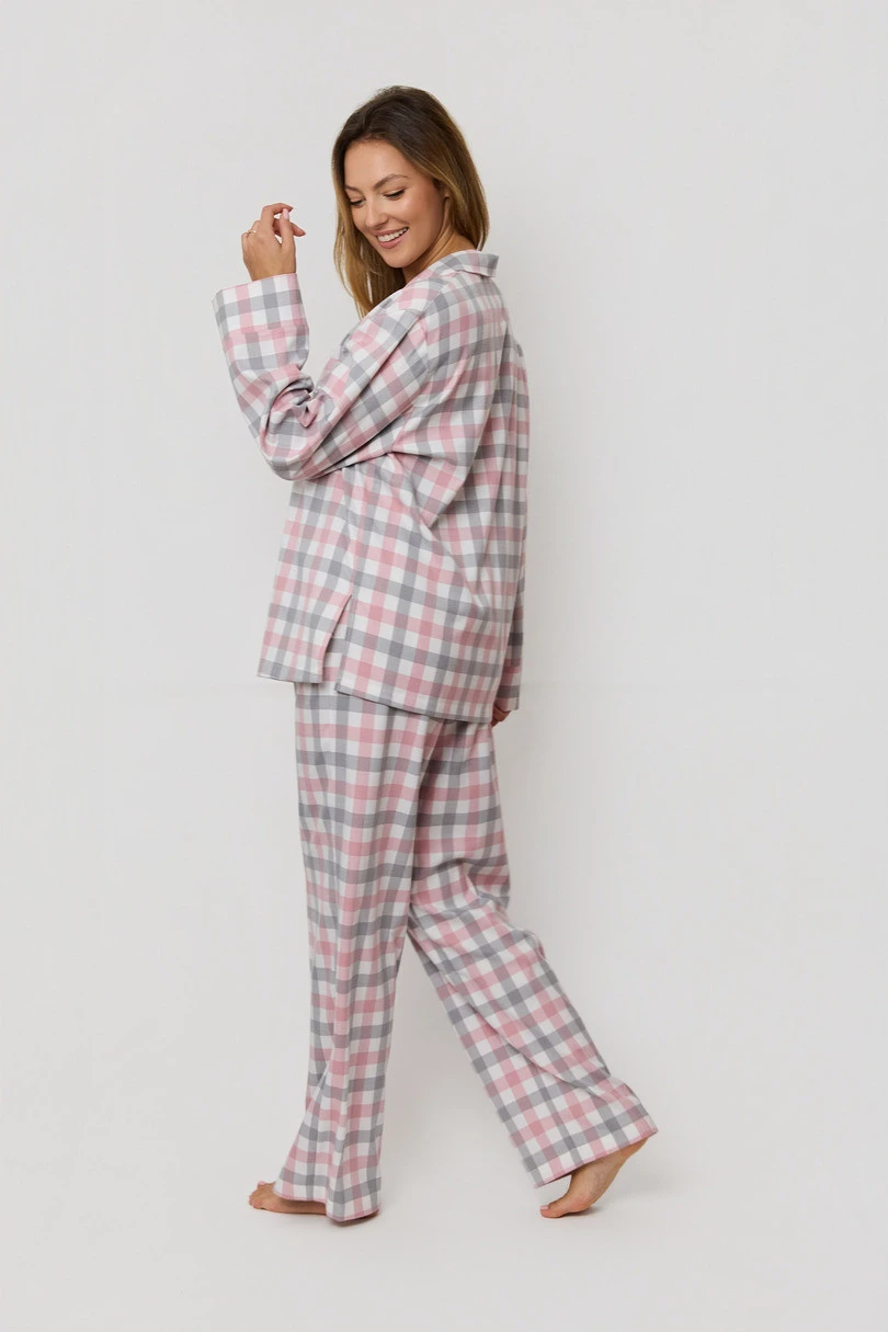 Górna część piżamy to bluza z długim rękawem, ozdobiona ponadczasowym kołnierzykiem i zapinana na guziki – praktyczne, stylowe rozwiązanie, które sprawdzi się zarówno w nocy, jak i podczas domowego relaksu. Wzór w kratkę nadaje całości szykownego charakteru. Długie spodnie wyposażono w wygodne kieszenie oraz elastyczną gumkę w tunelu, zapewniając pełną swobodę ruchów i idealne dopasowanie.