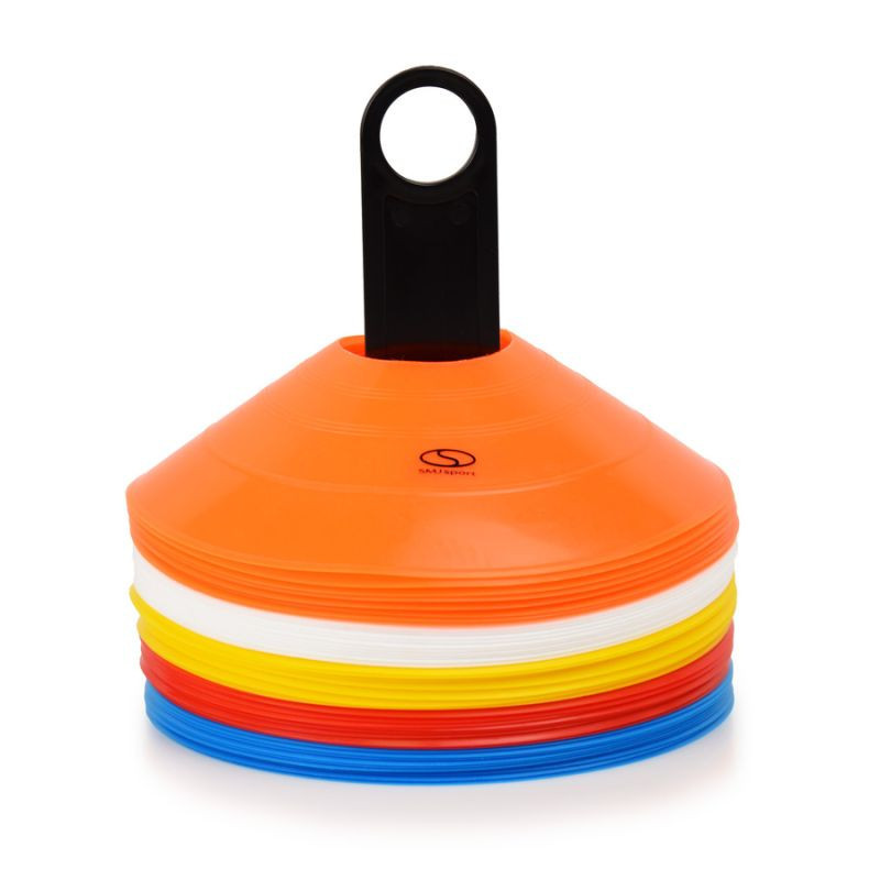 Kompletní sada 50 kónických tréninkových patníků (kuželů) vyrobených z pružného plastu. Každý kužel má průměr 19 cm, výšku 5 cm a váží pouhých 18 g. Součástí sady je stojan a síťované pouzdro pro snadné přenášení a skladování.