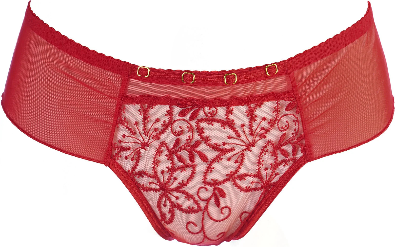 Červené kalhotky brazilského střihu způsobí, že se každému, kdo na vás pohlédne, zatočí hlava vzrušením. Přední stranu kalhotek zdobí květinový vyšívaný vzor, který dodává stylingu lehkost. Boky a hýždě jsou mezitím zahaleny do měkkého a pružného tylu a horní část kalhotek zdobí zlaté ornamenty, které celému kompletu dodávají lesk a rafinovanost. Materiálové složení: polyamid 67 %, polyester 24 %, bavlna 6 %, elastan 3 %