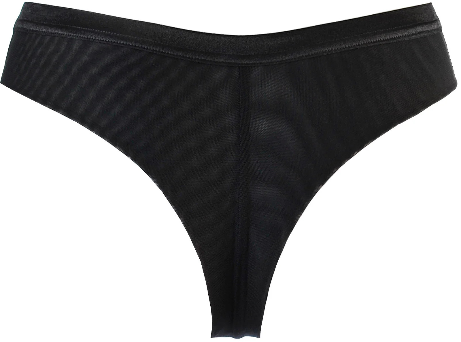 Elegantní a minimalistické kalhotky z poloprůhledné béžové síťoviny zdobené vzorem tenkých černých proužků, s pohodlným širokým elastickým pasem a zadní částí z dvojitě skládaného černého tylu, který se nerýsuje pod oblečením.