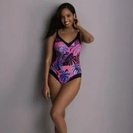 Dámské jednodílné plavky, vzadu černé, vepředu růžovo-modrý potisk listů. Jemně vyztužené košíčky s podpůrní gumou. Bez kostice.