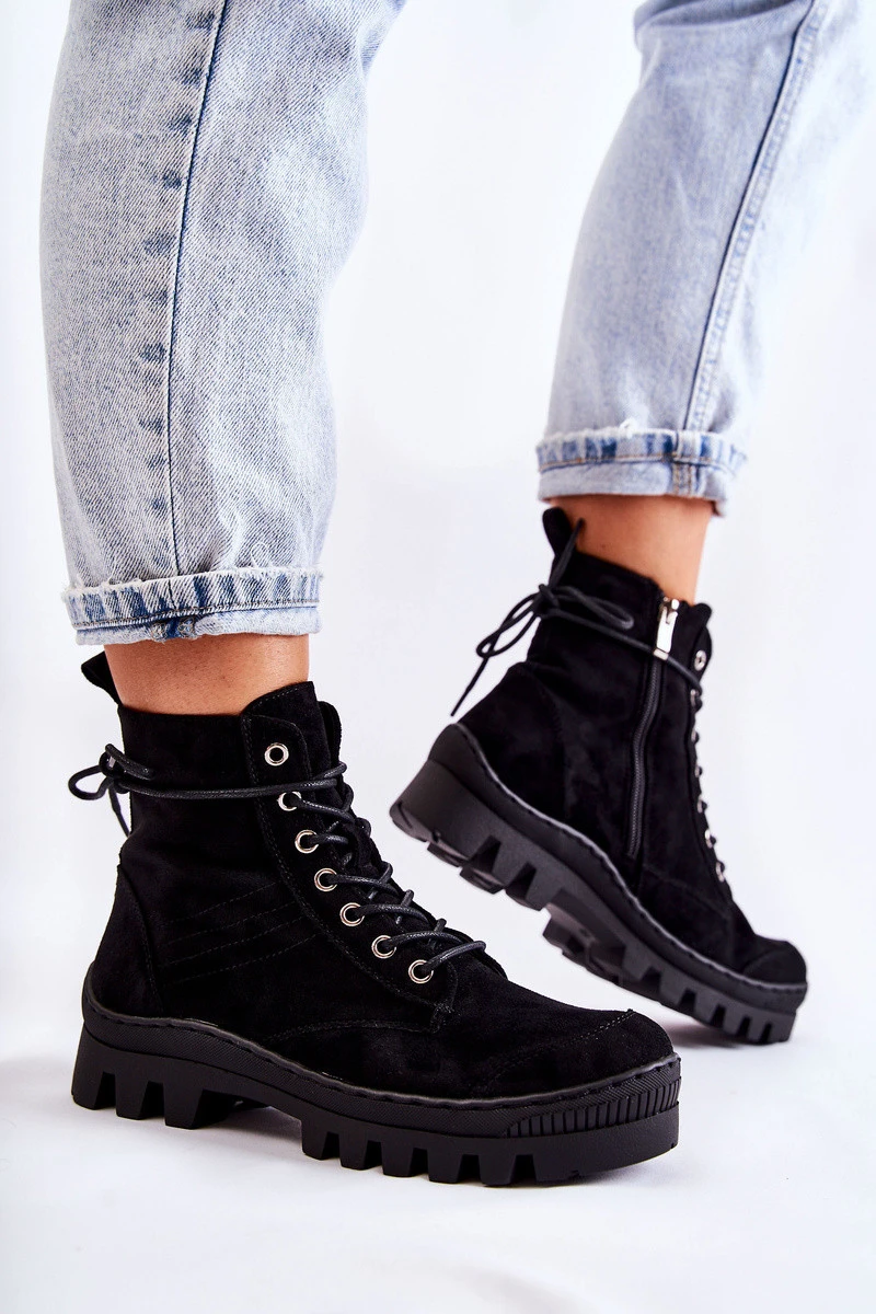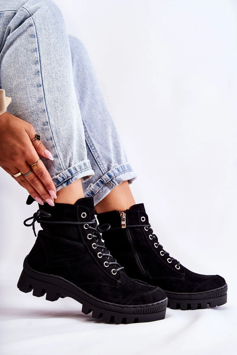 Boty namontované na silné platformě s vysokým běhounem. Přední část špičky je navíc vyztužena gumovým materiálem. Zapínání na vnitřní straně svršku na zip a navíc šněrování. Vyrobeno z měkkého ekologického semiše s bočním prošíváním. Vyztužený počítadlo paty. Skvělý look vytvoří s klasickými džínami nebo joggery, ale i s pletenými šaty. Při výběru velikosti použijte tabulku velikostí.