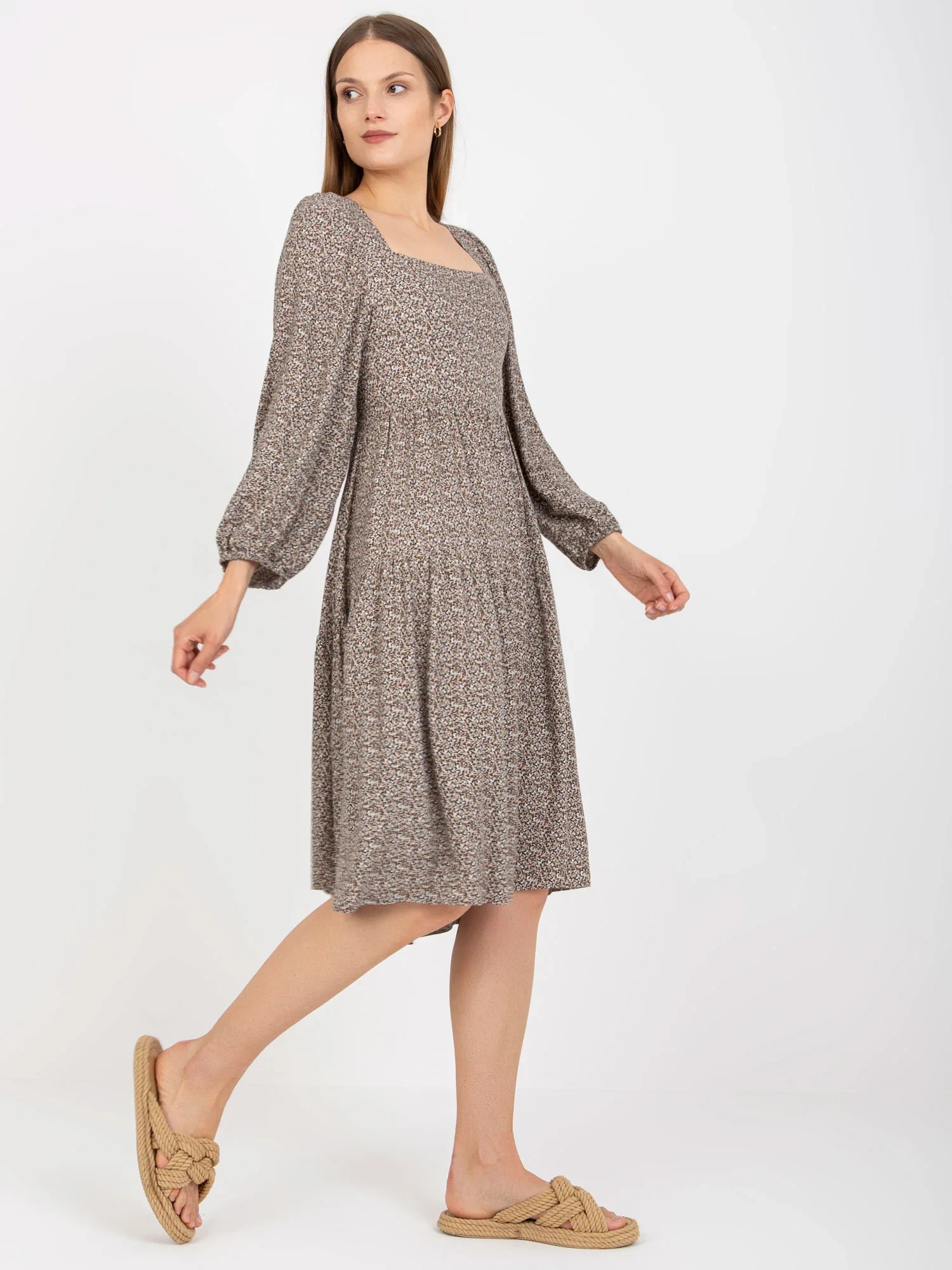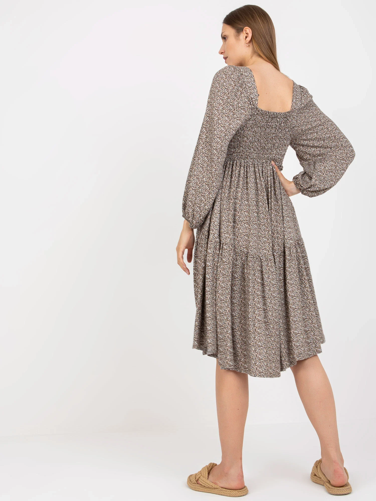 Wymiary sukienki w rozmiarze S/M mierzone na płasko: szerokość pod pachami - 39 cm, długość rękawa - 54 cm, długość całkowita - 108 cm.