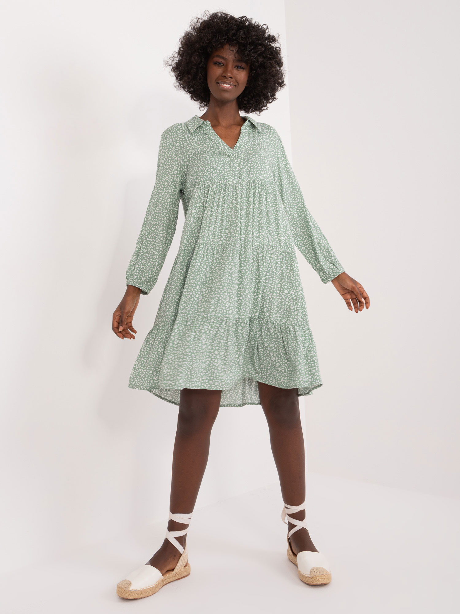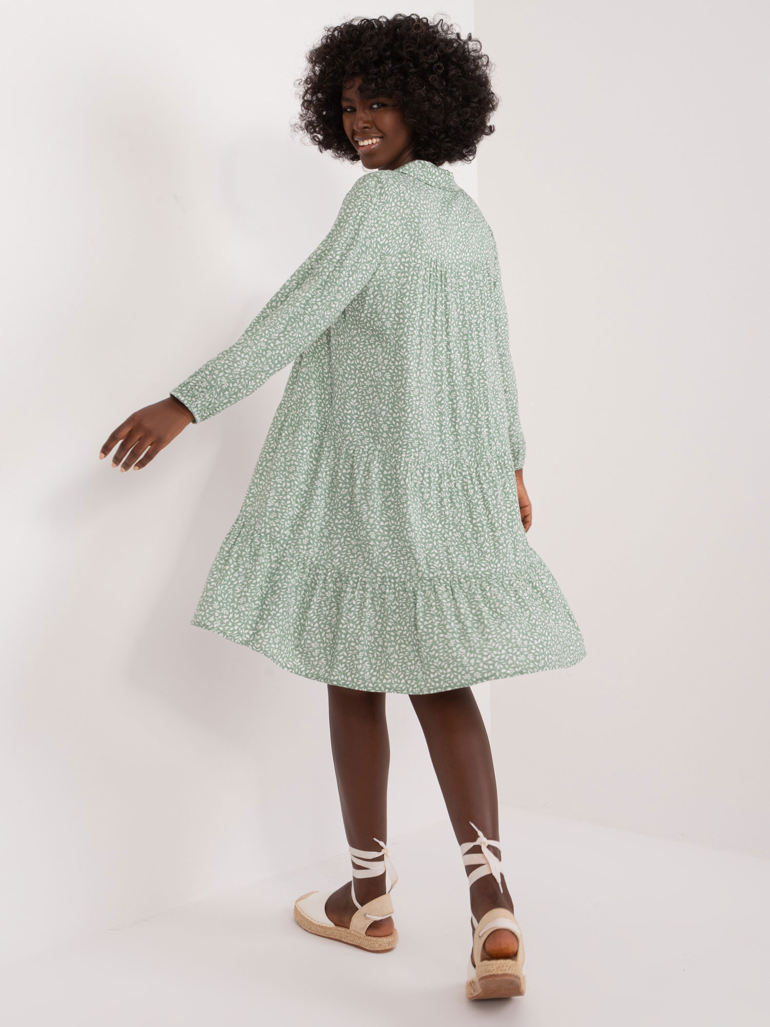 Wymiary sukienki w rozmiarze S mierzone na płasko: szerokość pod pachami - 50 cm, długość rękawa - 49 cm, długość całkowita - 94 cm.