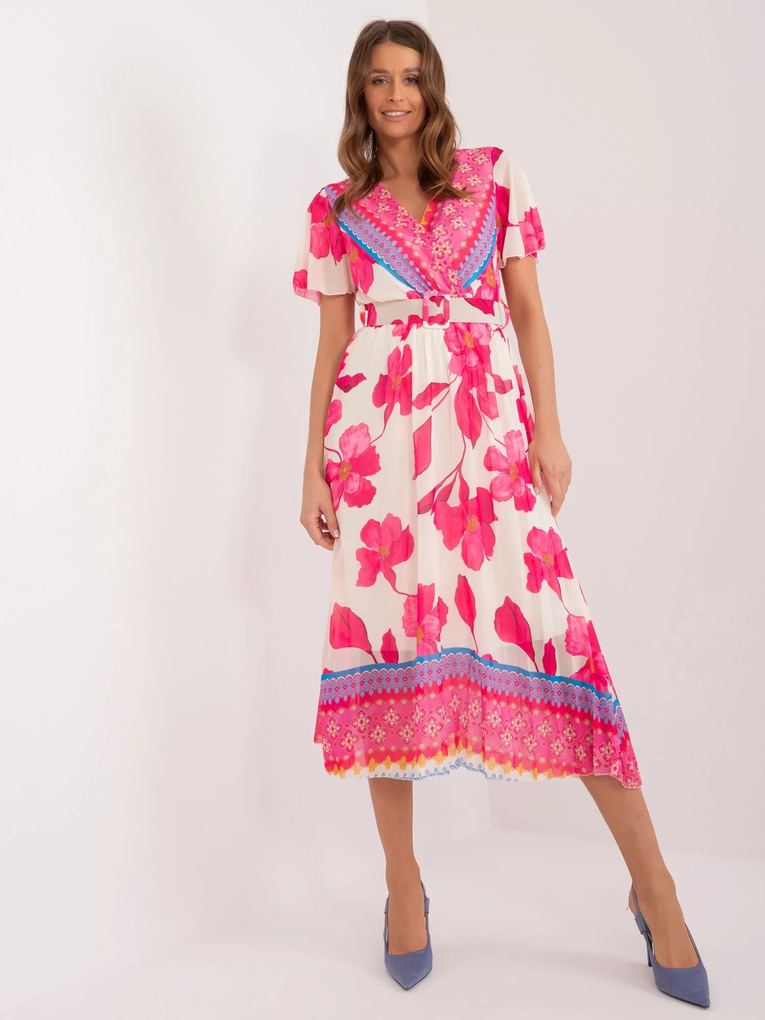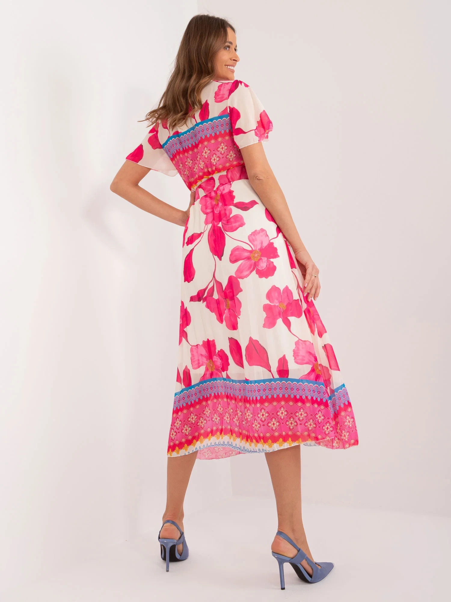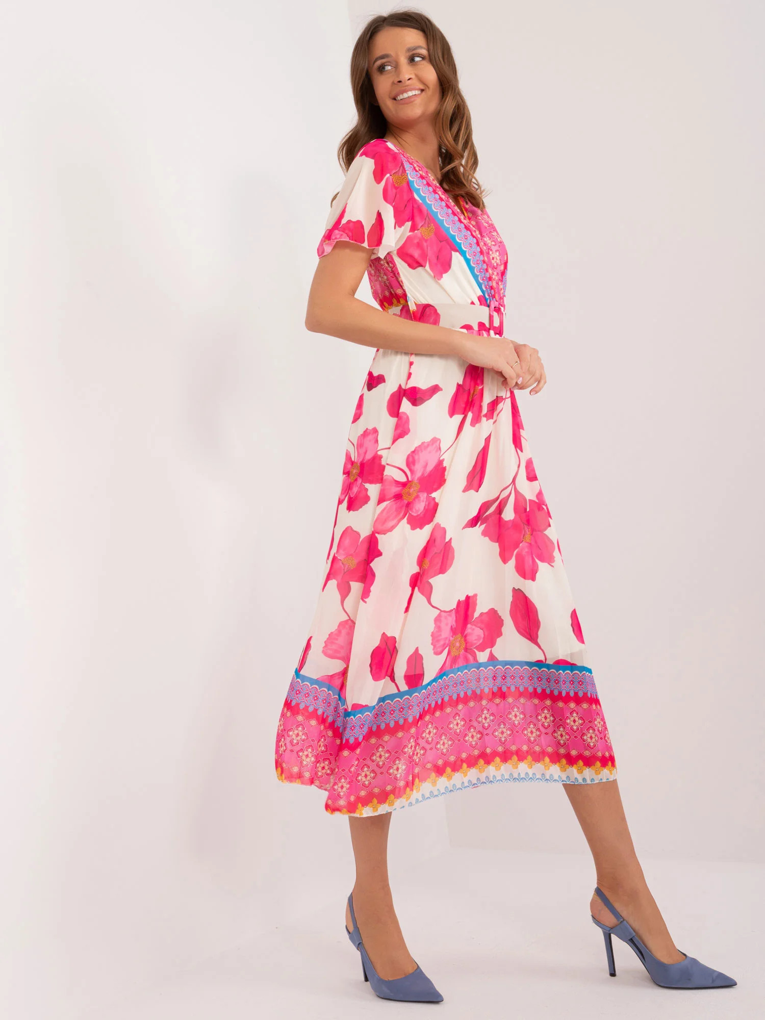 Wymiary sukienki w rozmiarze one size mierzone na płasko: szerokość pod pachami - 45 cm, długość całkowita - 122 cm, długość rękawa - 22 cm