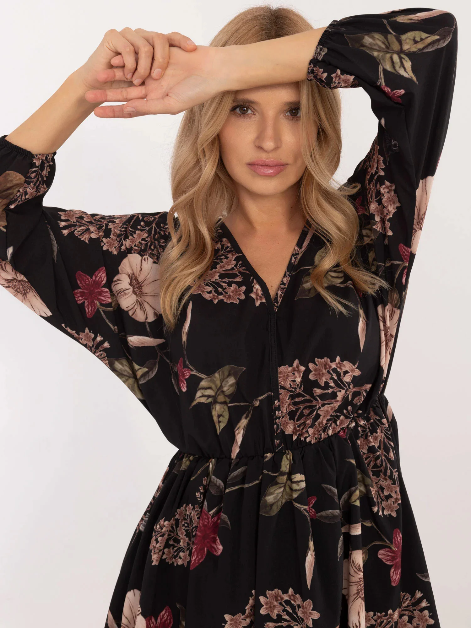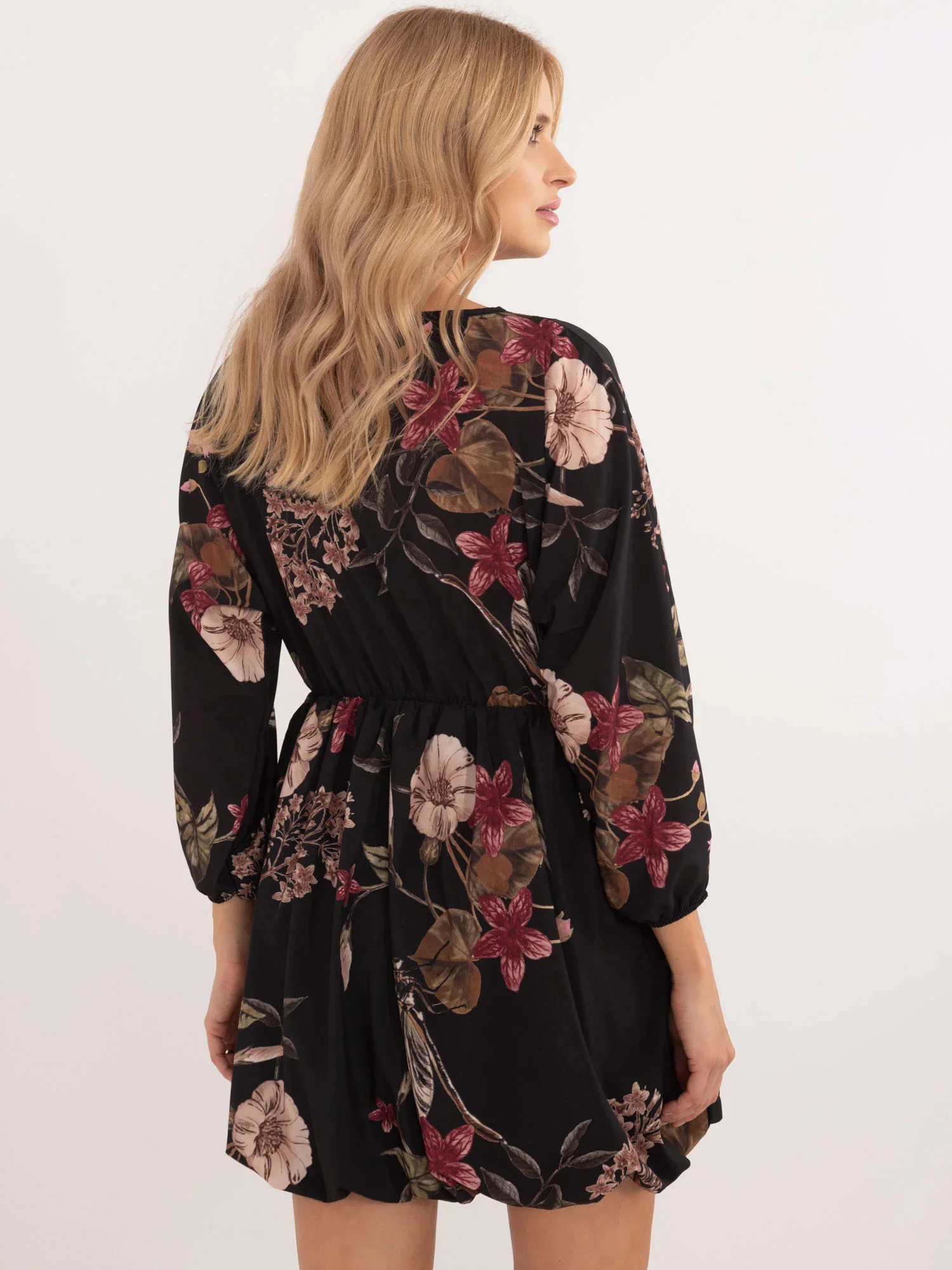 Wymiary sukienki w rozmiarze one size mierzone na płasko: szerokość pod pachami - 54 cm, długość całkowita - 84 cm, długość rękawa - 52 cm.