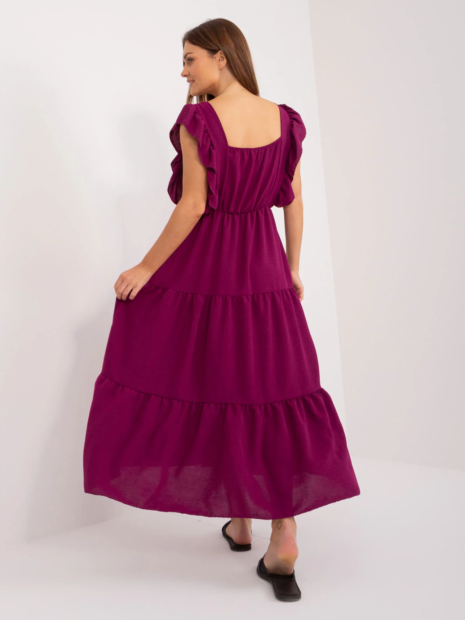 Wymiary sukienki w rozmiarze one size mierzone na płasko: szerokość pod pachami - 46 cm, długość całkowita - 127 cm.