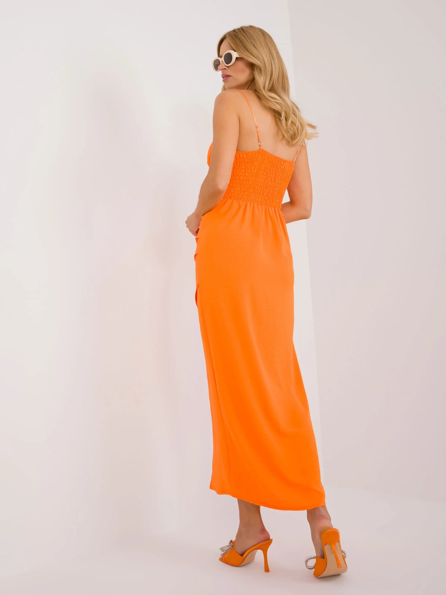 Wymiary sukienki w rozmiarze one size mierzone na płasko: szerokość pod pachami - 33 cm, długość całkowita - 123 cm (bez ramiączek), długość całkowita - 140 cm (z ramiączkami).