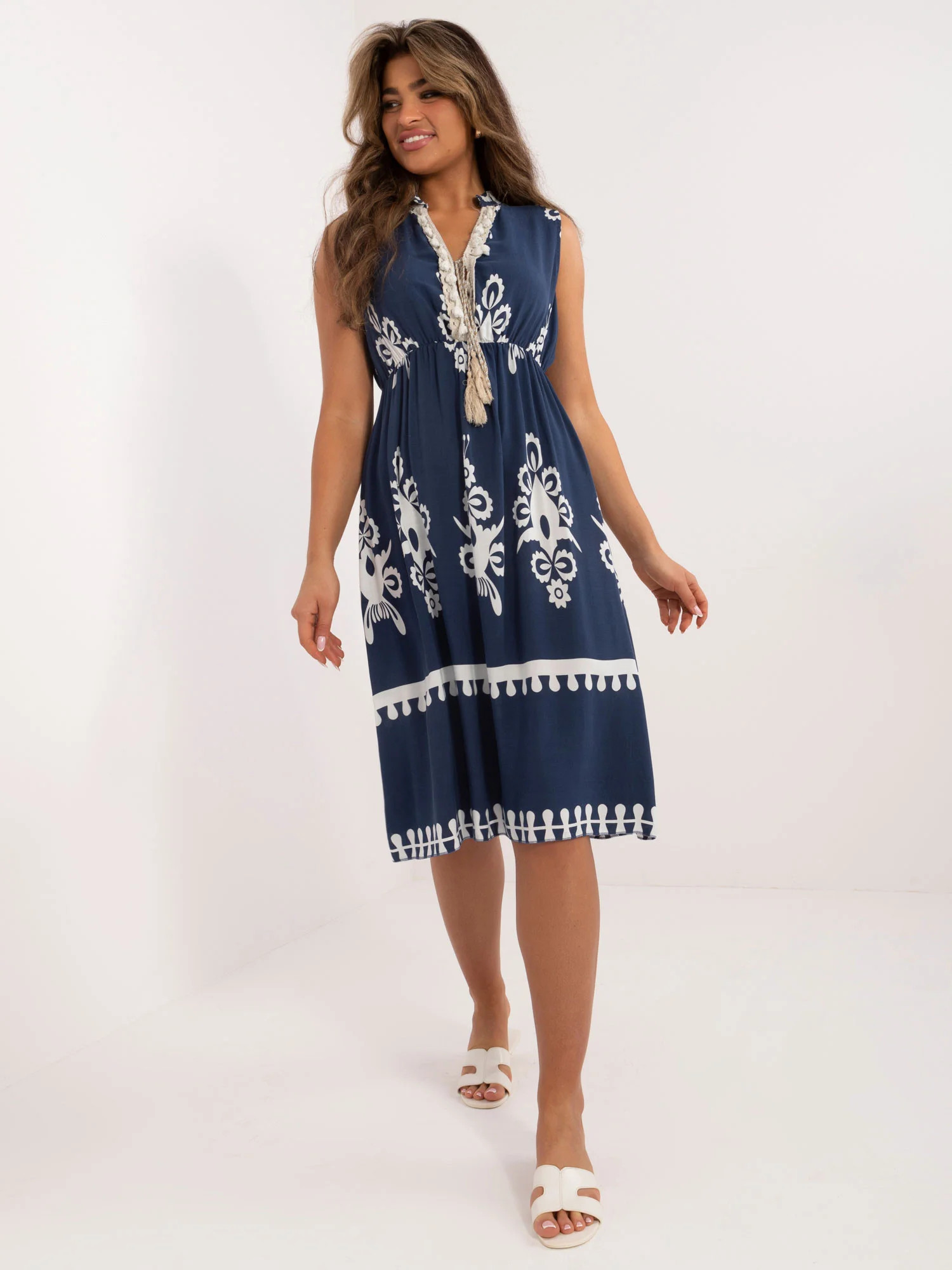 Wymiary sukienki w rozmiarze one size mierzone na płasko: szerokość pod pachami - 48 cm, długość całkowita - 110 cm.