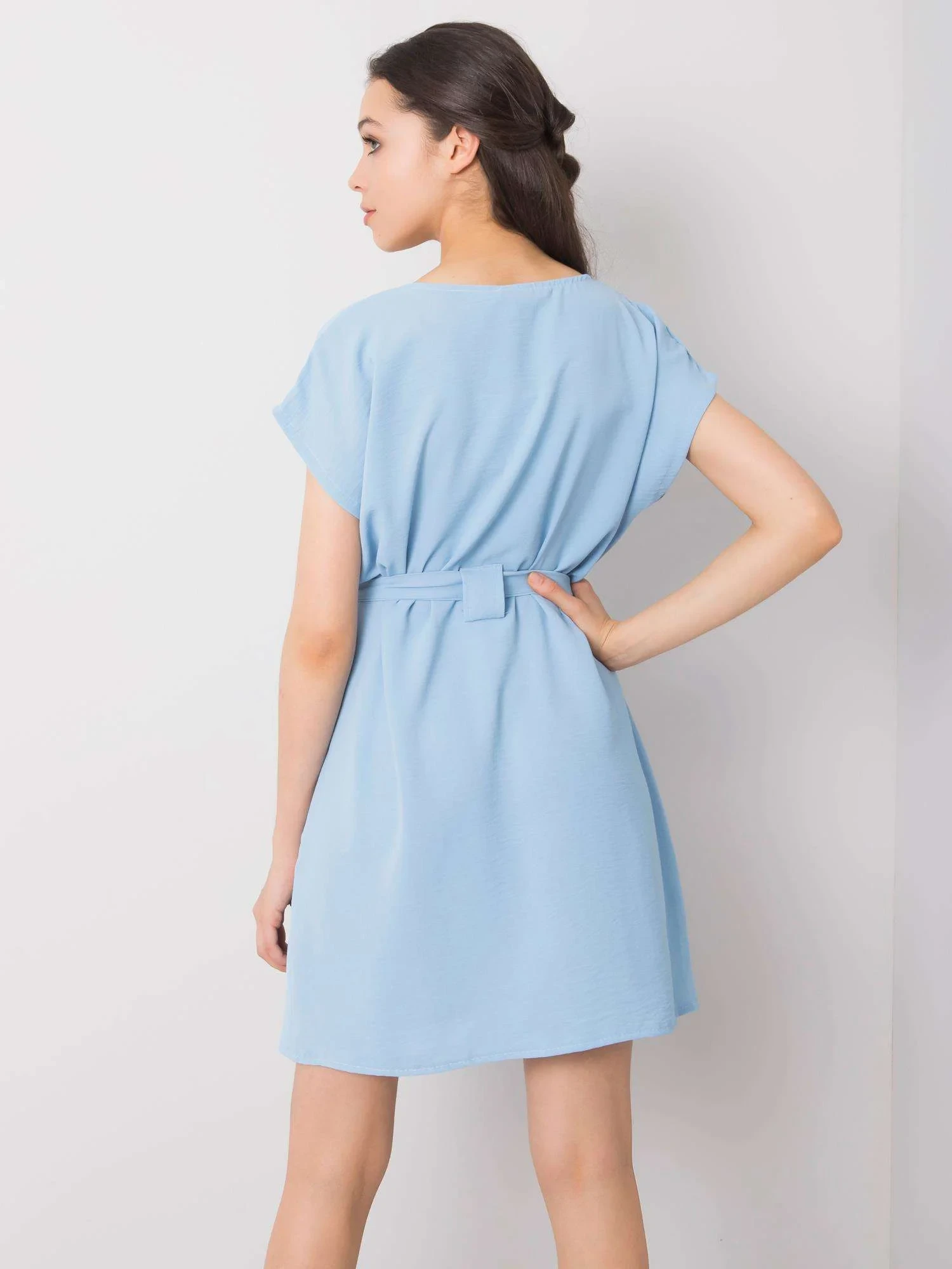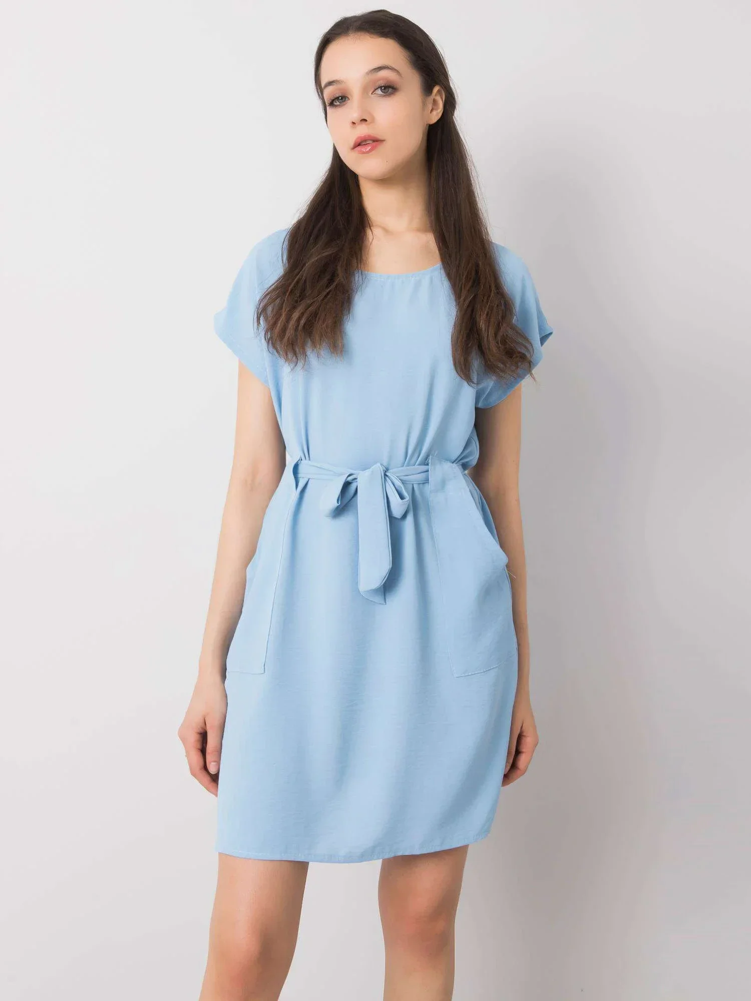 Niebieska sukienka z kieszeniami.