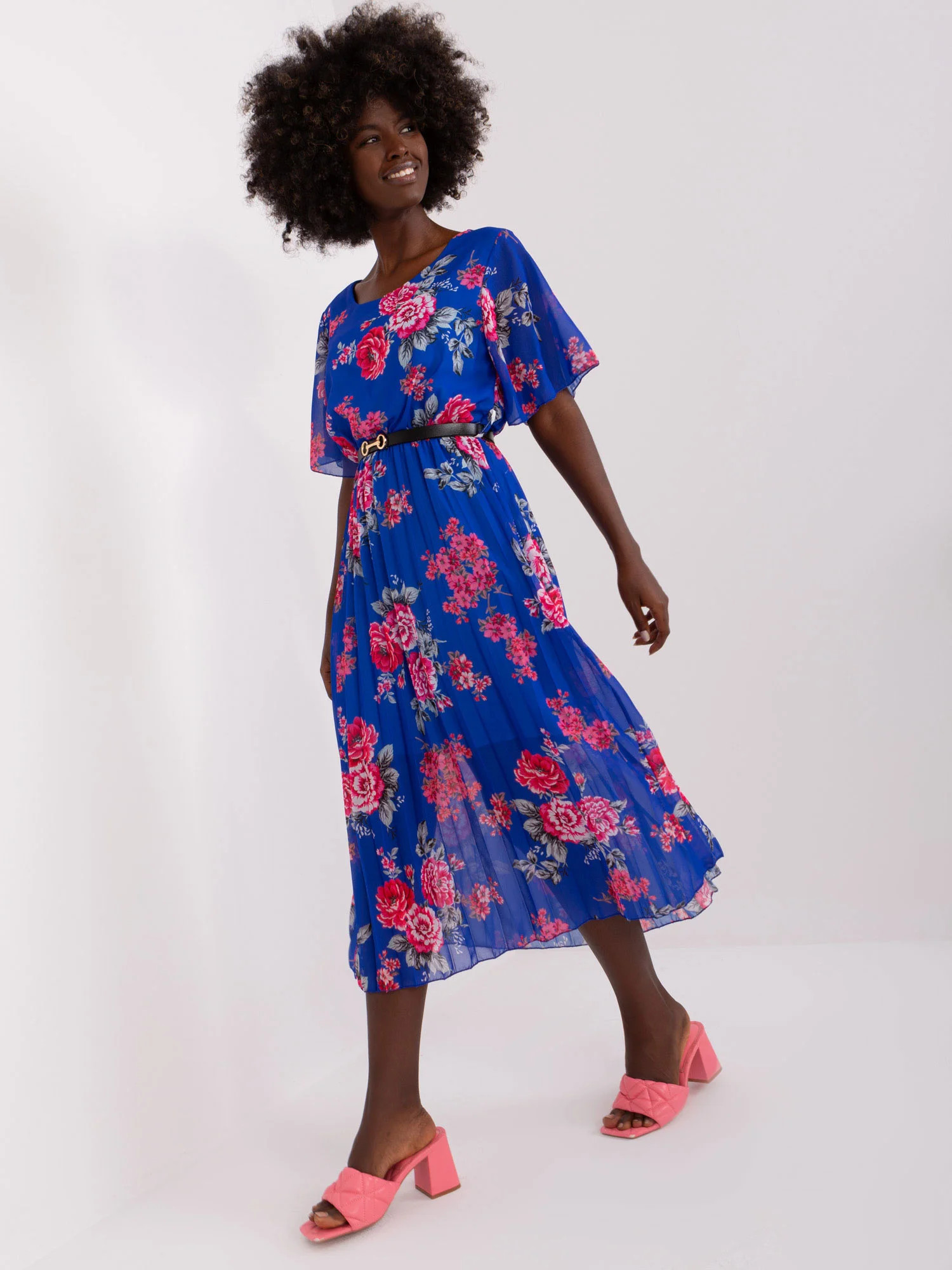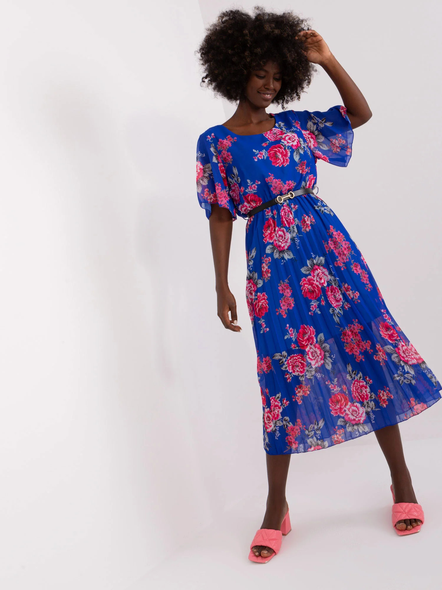 Kobaltowa plisowana sukienka w kwiaty .