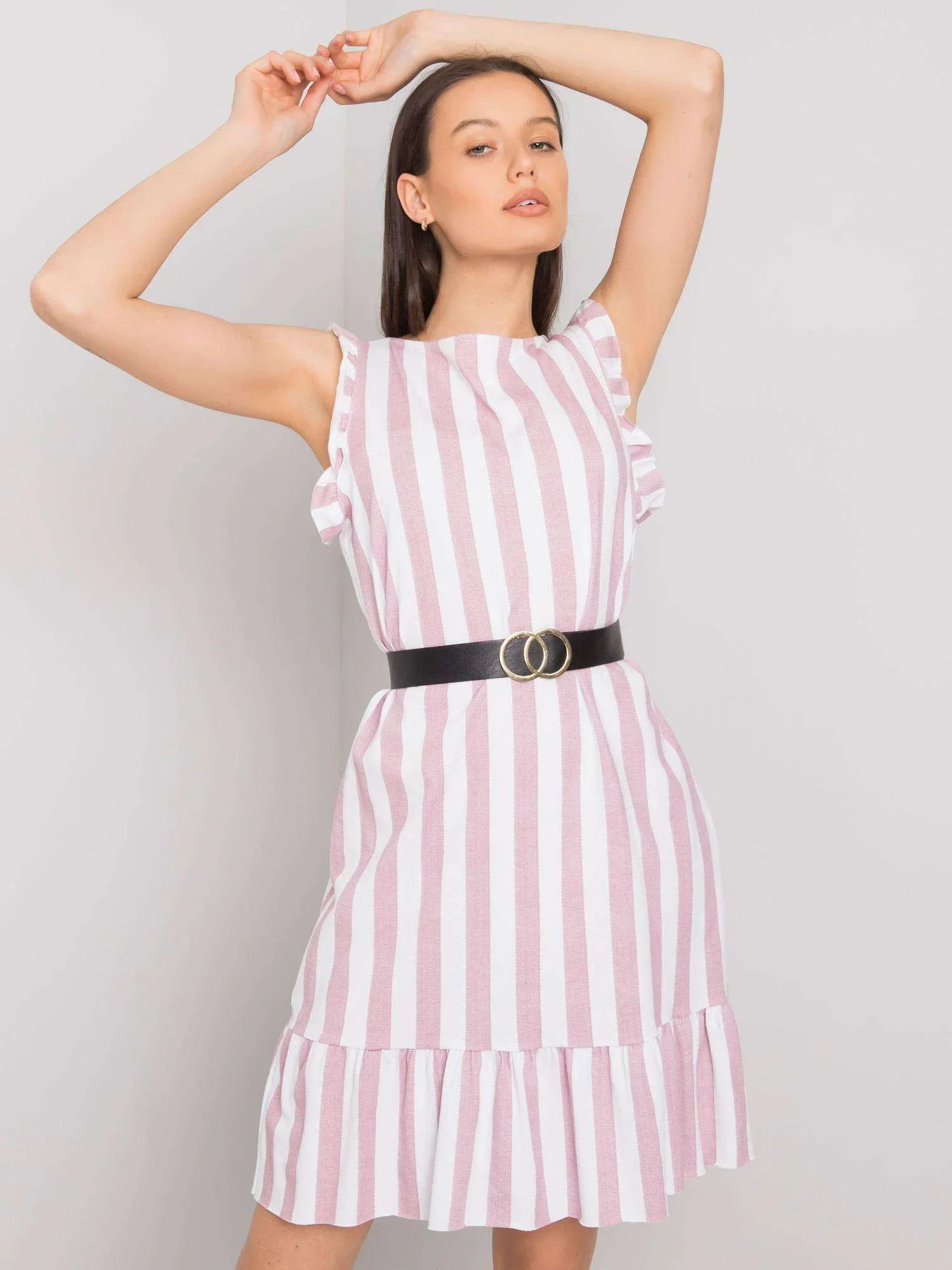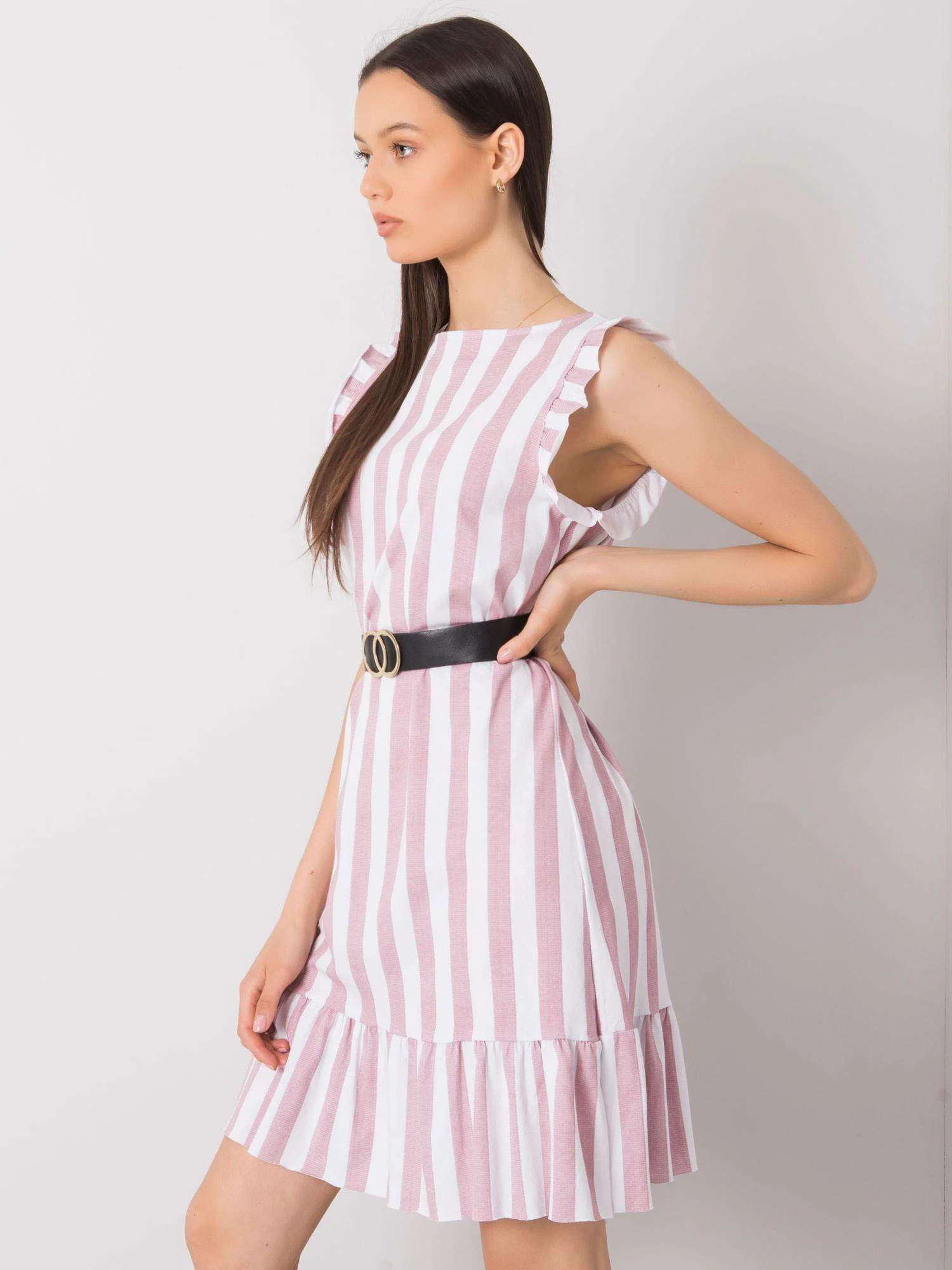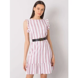 Brudnoróżowa sukienka w paski z falbaną.