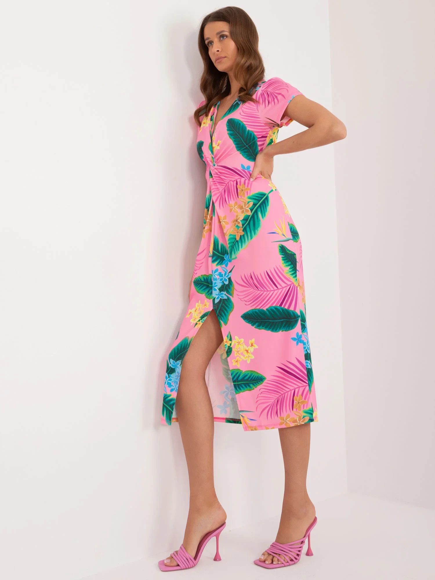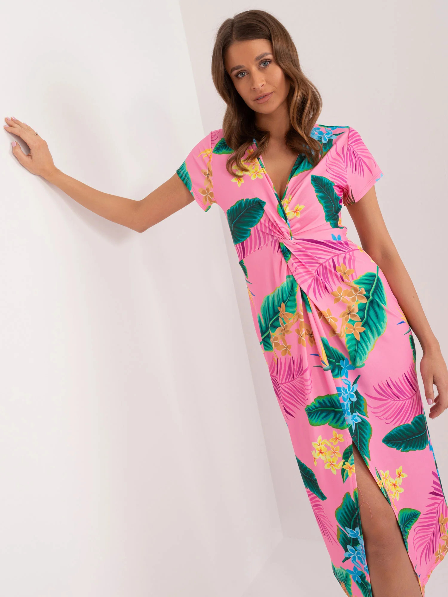 Wymiary sukienki w rozmiarze one size mierzone na płasko: szerokość pod pachami - 41 cm, długość całkowita - 118 cm, długość rękawa - 14 cm