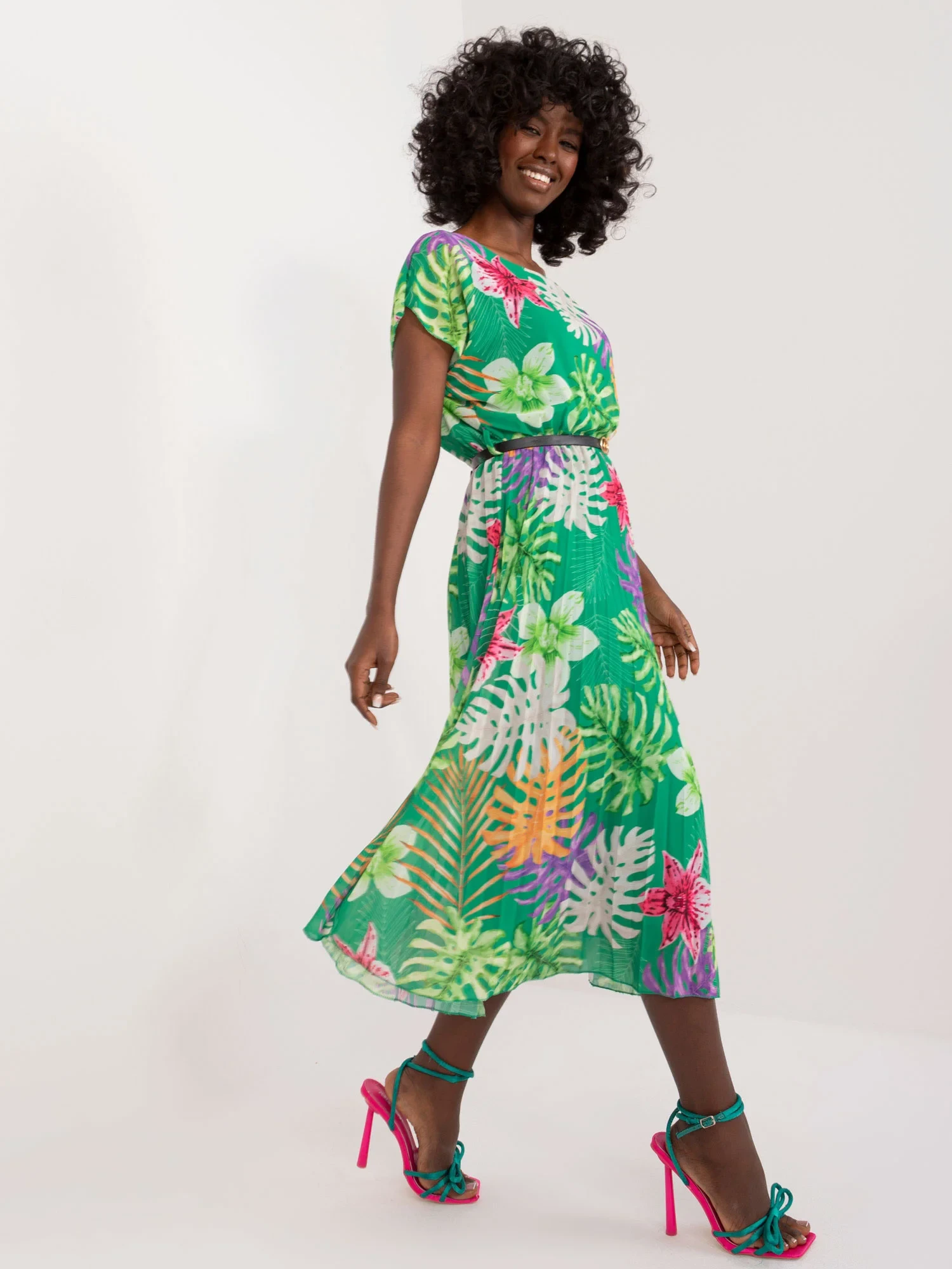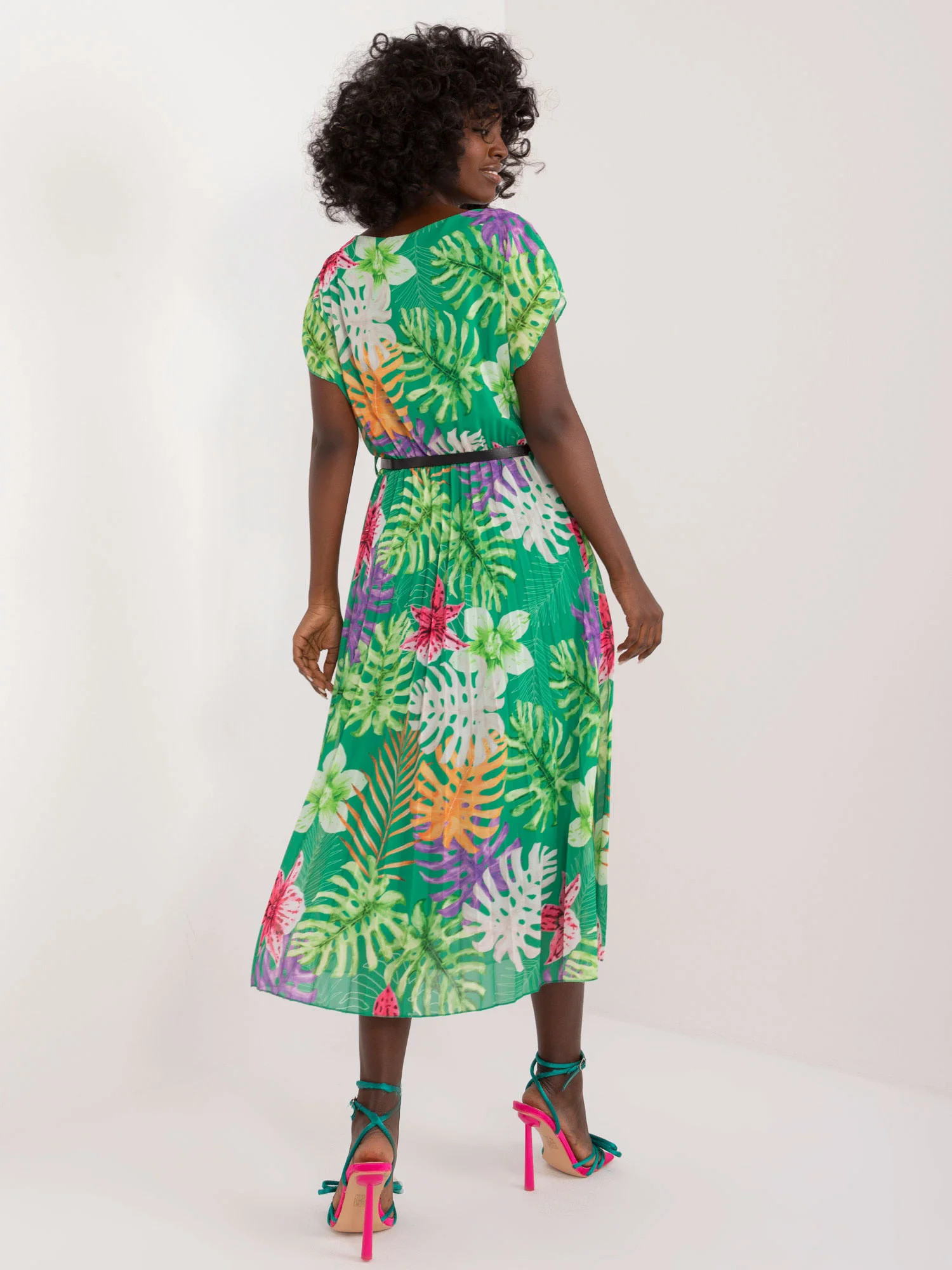 Wymiary sukienki w rozmiarze one size mierzone na płasko: szerokość pod pachami - 46 cm, długość całkowita - 111 cm.