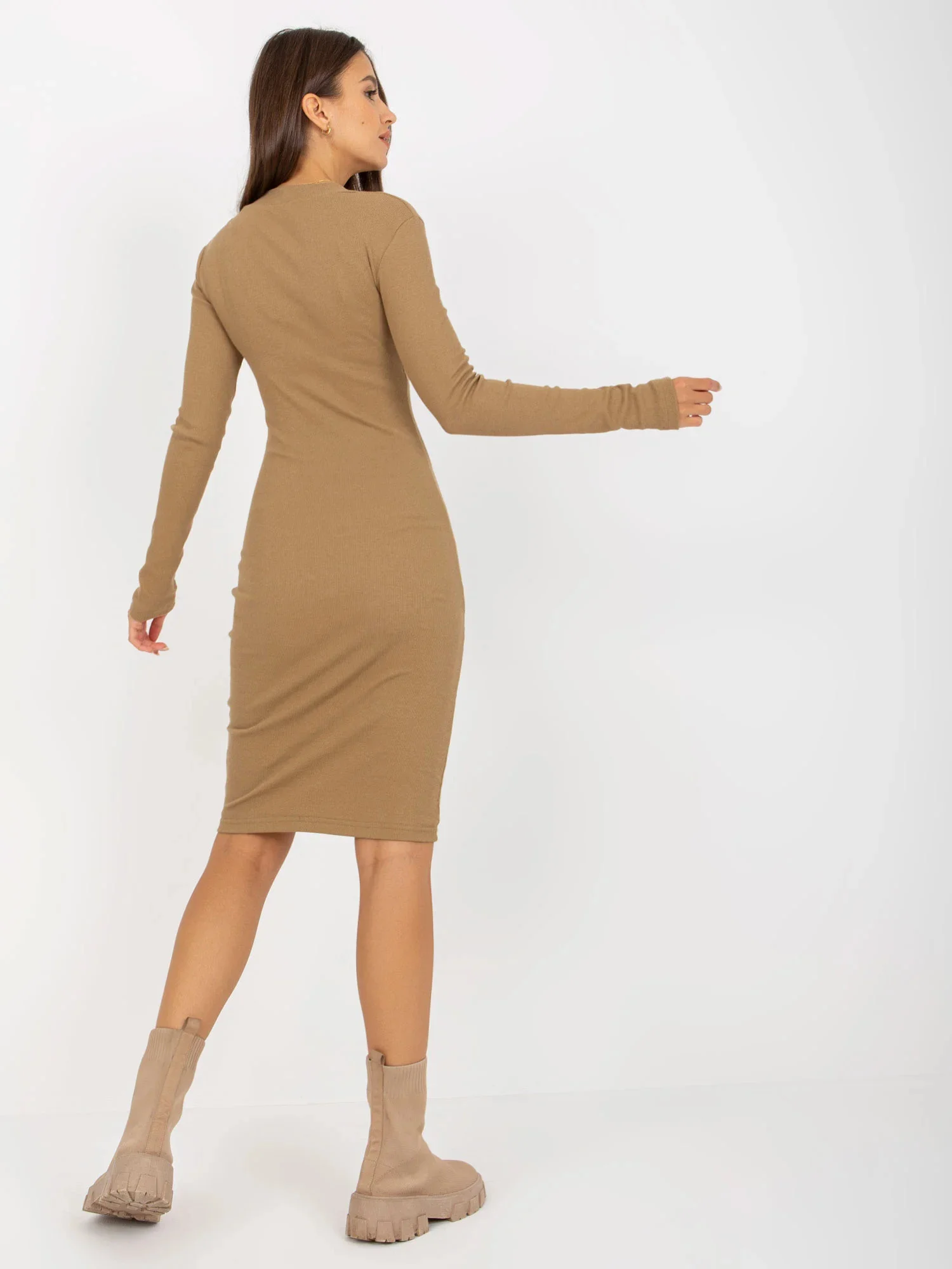 Camelowa dopasowana sukienka basic w prążki z okrągłym dekoltem.