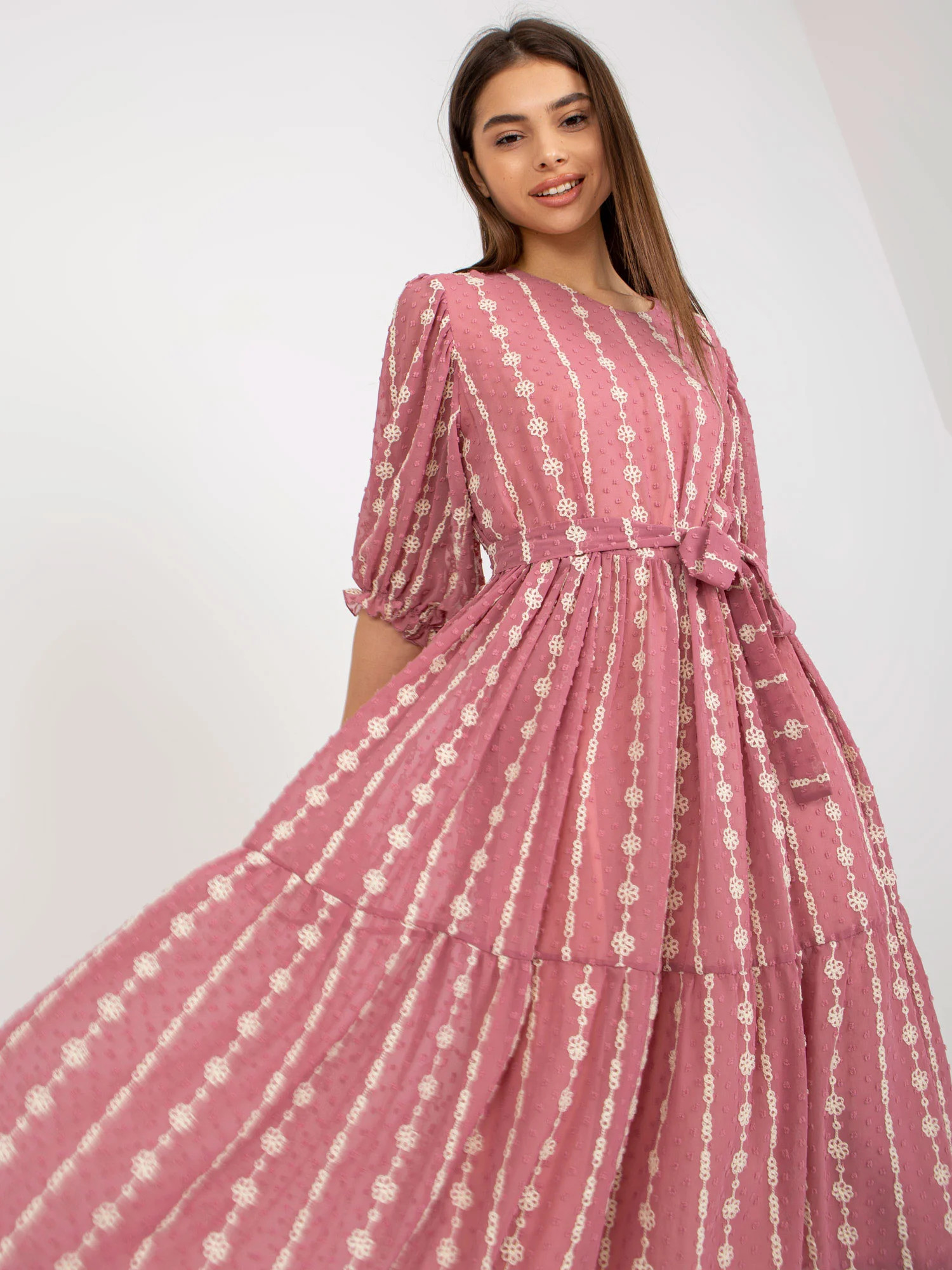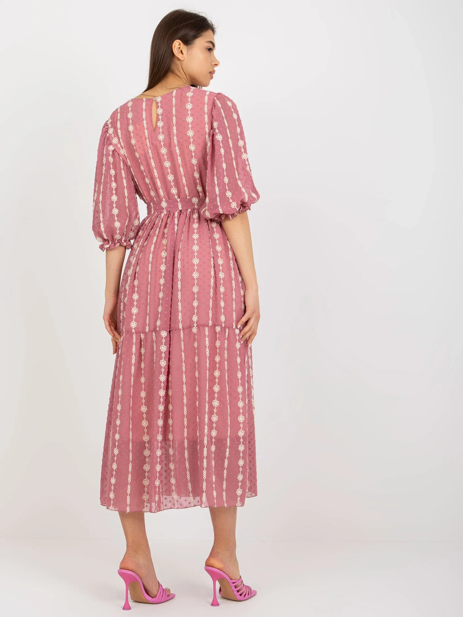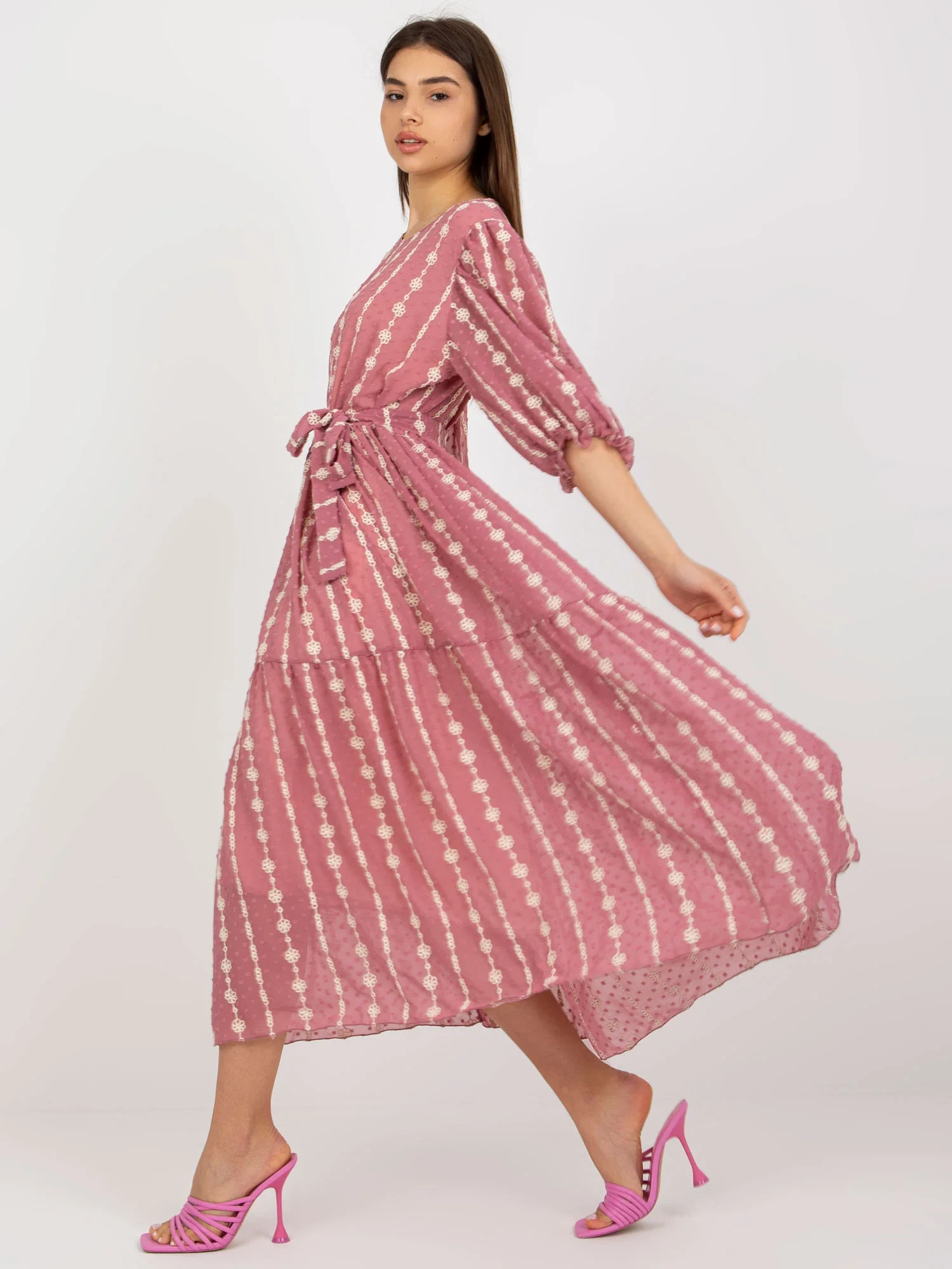Brudnoróżowa midi sukienka z falbaną i haftem .