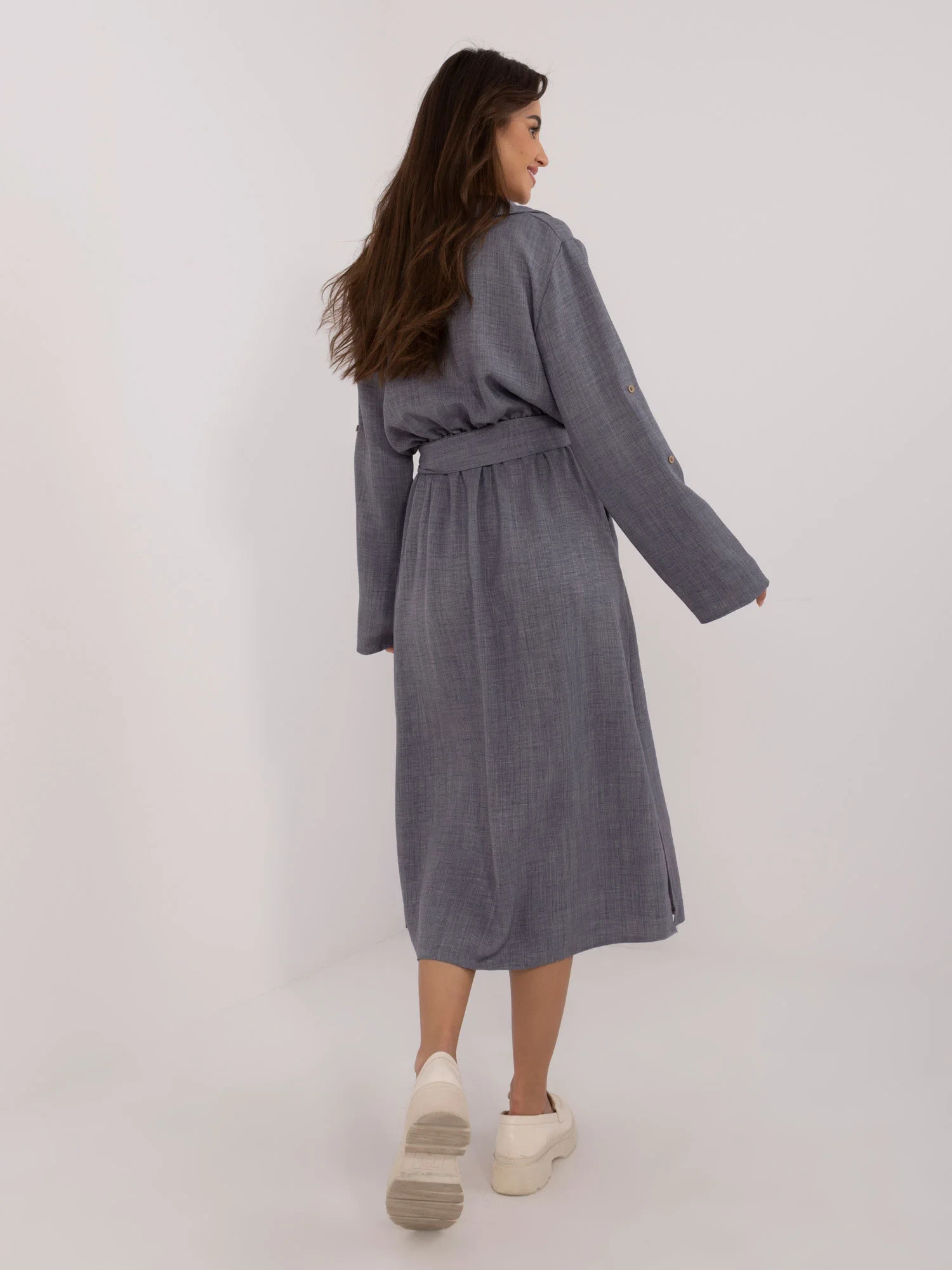 Wymiary sukienki w rozmiarze S/M mierzone na płasko: szerokość pod pachami - 54 cm, długość rękawa - 60 cm, długość całkowita - 125 cm.