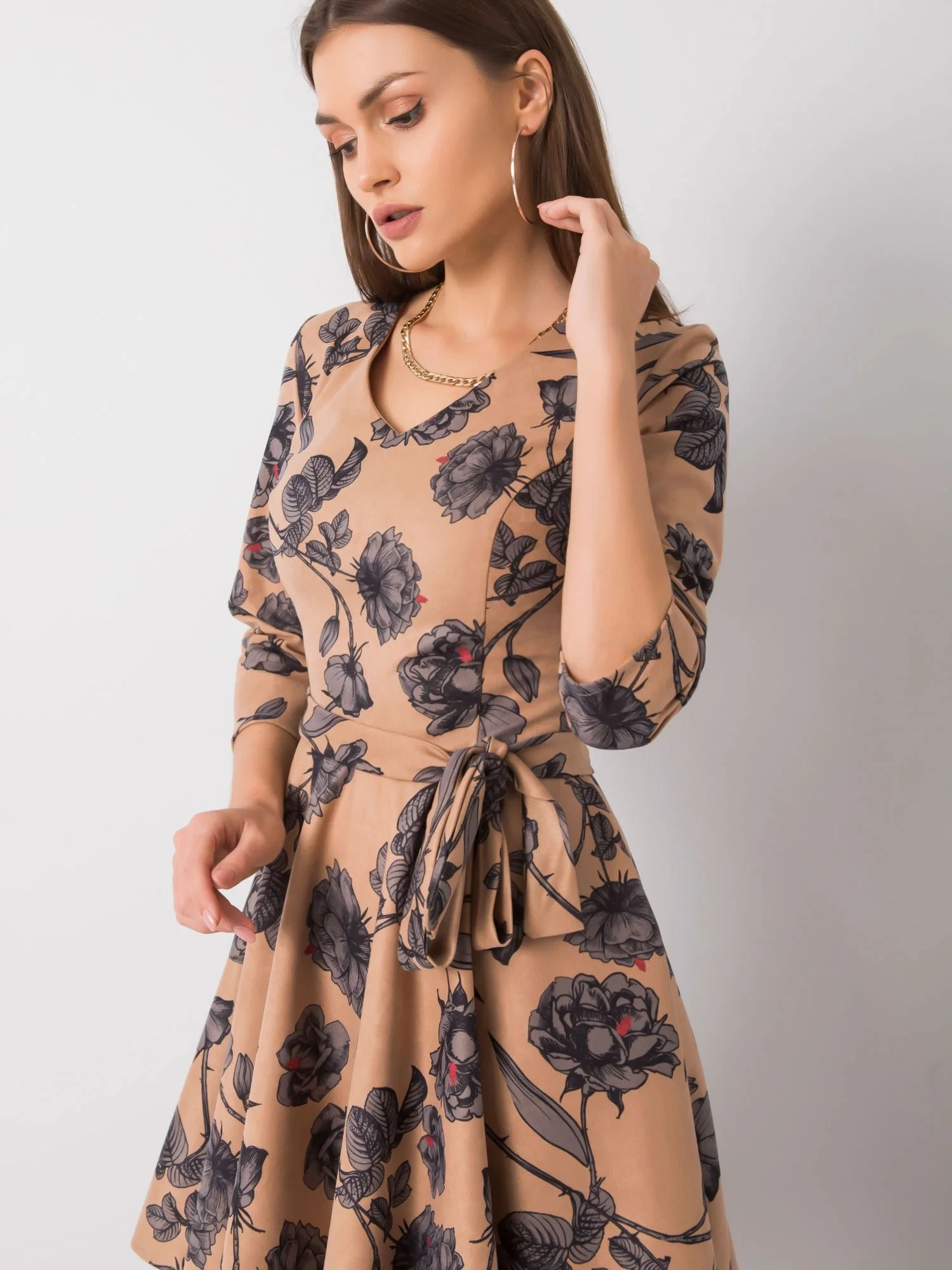 Beżowo-szara sukienka w kwiaty z paskiem.